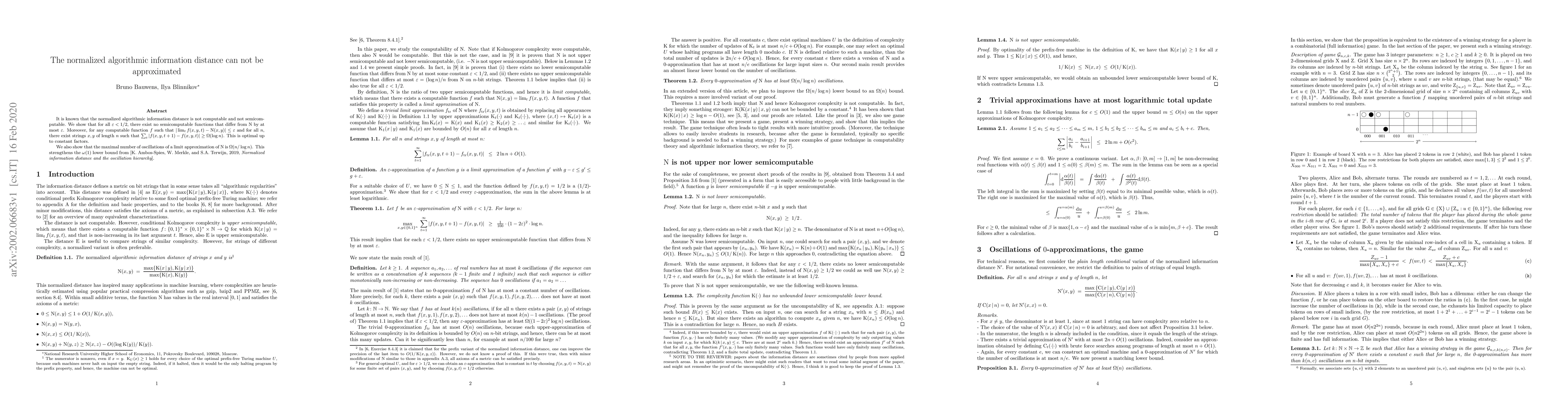 The paper demonstrates that the normalized algorithmic information distance cannot be approximated by any computable or semicomputable function, showing that any approximation must exhibit significant oscillations, with the maximal number of oscillations being $\Omega(n/\log n)$. This result strengthens previous lower bounds on the oscillation hierarchy.