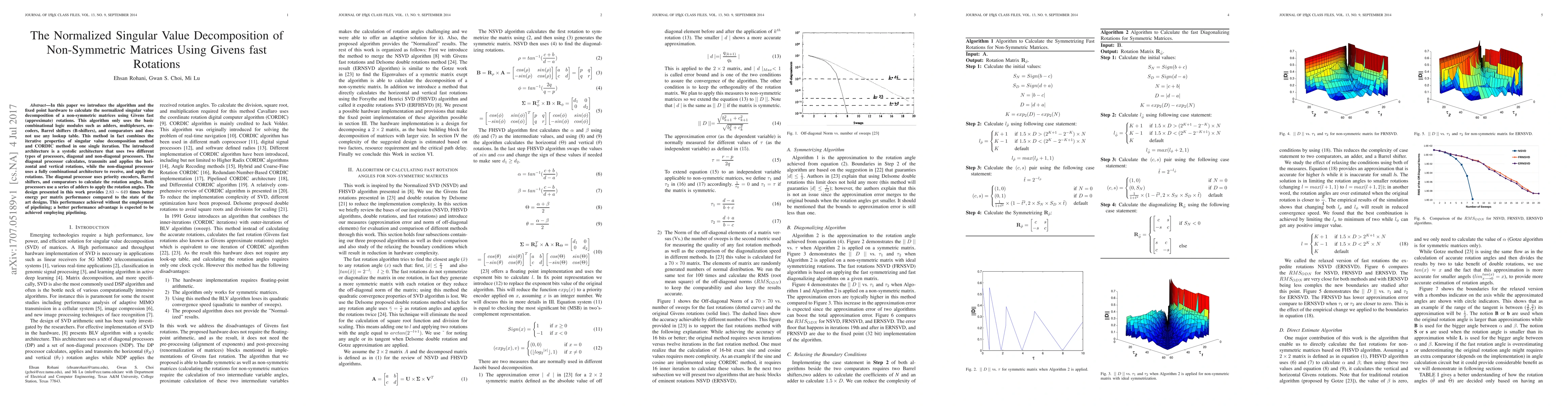 In this paper we introduce the algorithm and the fixed point hardware to calculate the normalized singular value decomposition of a non-symmetric matrices using Givens fast (approximate) rotations. This algorithm only uses the basic combinational logic modules such as adders, multiplexers, encoders, Barrel shifters (B-shifters), and comparators and does not use any lookup table. This method in fact combines the iterative properties of singular value decomposition method and CORDIC method in one single iteration. The introduced architecture is a systolic architecture that uses two different types of processors, diagonal and non-diagonal processors. The diagonal processor calculates, transmits and applies the horizontal and vertical rotations, while the non-diagonal processor uses a fully combinational architecture to receive, and apply the rotations. The diagonal processor uses priority encoders, Barrel shifters, and comparators to calculate the rotation angles. Both processors use a series of adders to apply the rotation angles. The design presented in this work provides $2.83\sim649$ times better energy per matrix performance compared to the state of the art designs. This performance achieved without the employment of pipelining; a better performance advantage is expected to be achieved employing pipelining.