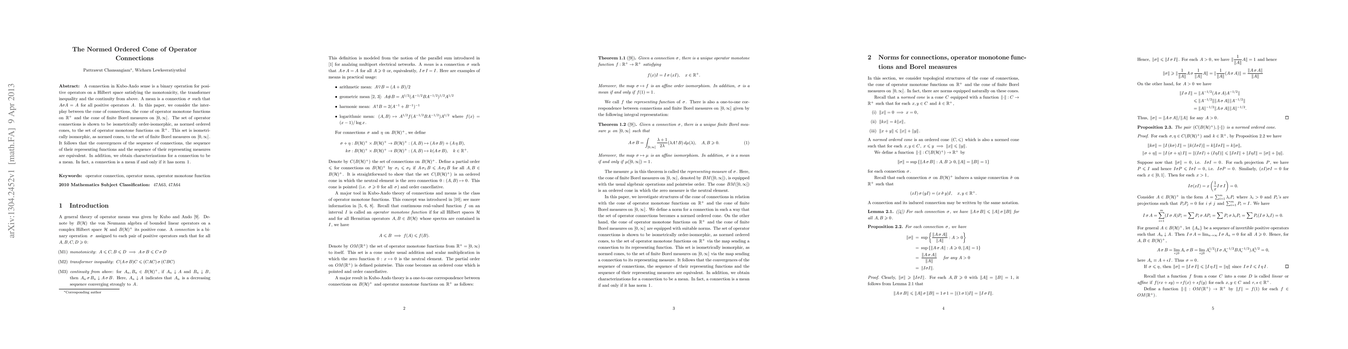 A connection in Kubo-Ando sense is a binary operation for positive operators on a Hilbert space satisfying the monotonicity, the transformer inequality and the continuity from above. A mean is a connection $\sigma$ such that $A \sigma A =A$ for all positive operators $A$. In this paper, we consider the interplay between the cone of connections, the cone of operator monotone functions on $\R^+$ and the cone of finite Borel measures on $[0,\infty]$. %We define a norm for a connection in such a way that the set of operator connections becomes %a normed ordered cone. %On the other hand, the cone of operator monotone functions on $\R^+$ %and the cone of finite Borel measures on $[0,\infty]$ are equipped with suitable norms. The set of operator connections is shown to be isometrically order-isomorphic, as normed ordered cones, to the set of operator monotone functions on $\R^+$. This set is isometrically isomorphic, as normed cones, to the set of finite Borel measures on $[0,\infty]$. It follows that the convergences of the sequence of connections, the sequence of their representing functions and the sequence of their representing measures are equivalent. In addition, we obtain characterizations for a connection to be a mean. In fact, a connection is a mean if and only if it has norm 1.