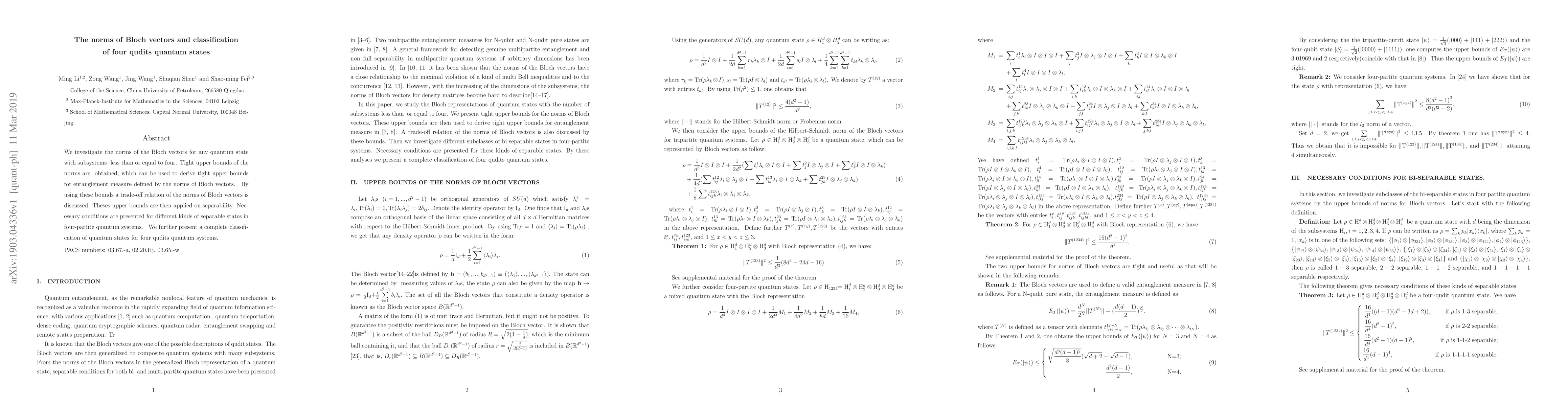 We investigate the norms of the Bloch vectors for any quantum state with subsystems less than or equal to four. Tight upper bounds of the norms are obtained, which can be used to derive tight upper bounds for entanglement measure defined by the norms of Bloch vectors. By using these bounds a trade-off relation of the norms of Bloch vectors is discussed. Theses upper bounds are then applied on separability. Necessary conditions are presented for different kinds of separable states in four-partite quantum systems. We further present a complete classification of quantum states for four qudits quantum systems.