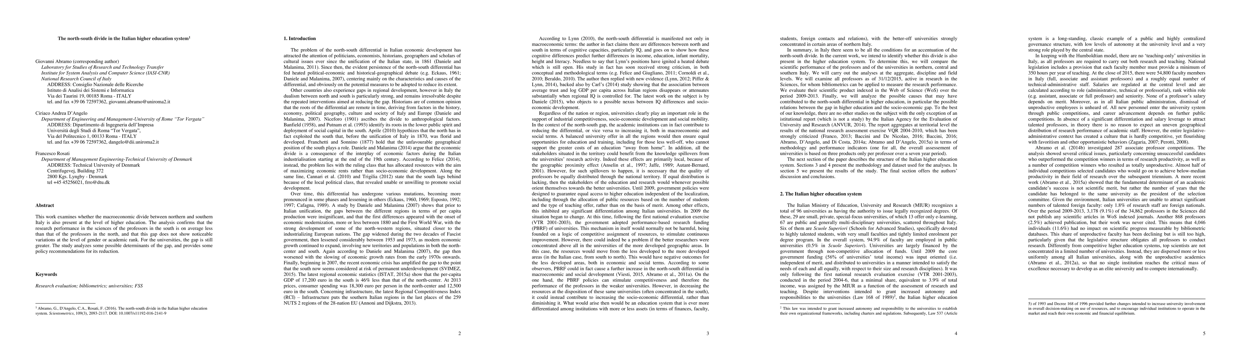 This paper investigates the north-south divide in Italy's higher education system, finding that southern professors exhibit lower research performance in sciences compared to their northern counterparts, with no significant gender or rank differences. The study also highlights the larger gap at the university level and offers policy recommendations to mitigate this disparity.
