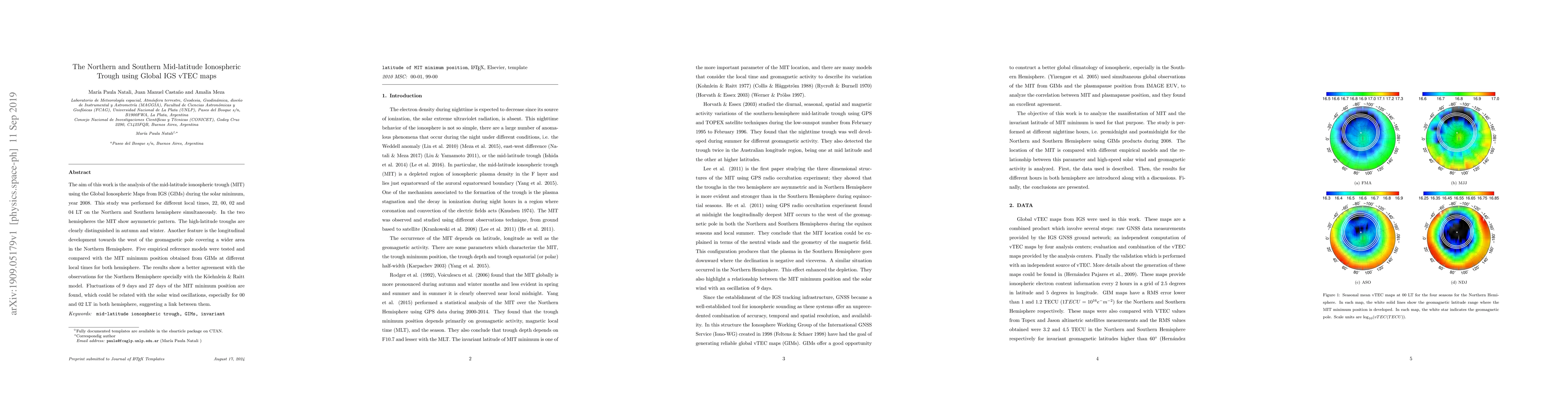 This study analyzes the mid-latitude ionospheric trough (MIT) using Global Ionospheric Maps from IGS during solar minimum 2008, revealing asymmetric patterns in the Northern and Southern Hemispheres. The Northern Hemisphere shows a wider longitudinal development, and the Köhnlein & Raitt model best matches observed data.