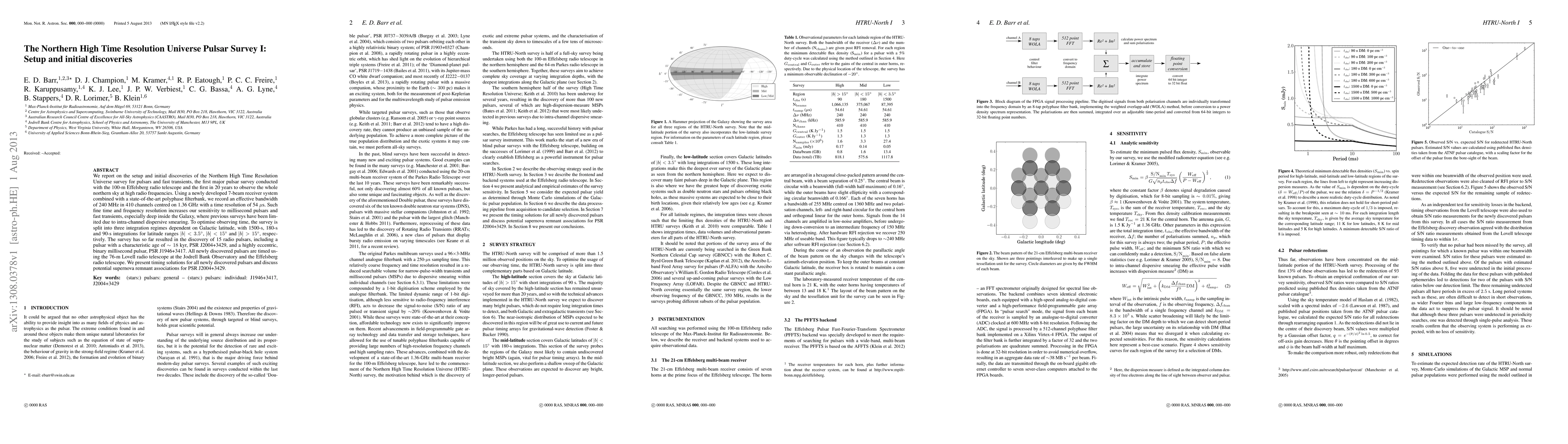 The Northern High Time Resolution Universe Pulsar Survey utilizes the Effelsberg radio telescope to conduct the first major northern sky pulsar survey in 20 years, discovering 15 pulsars, including a highly eccentric binary millisecond pulsar, with improved sensitivity due to high time resolution.