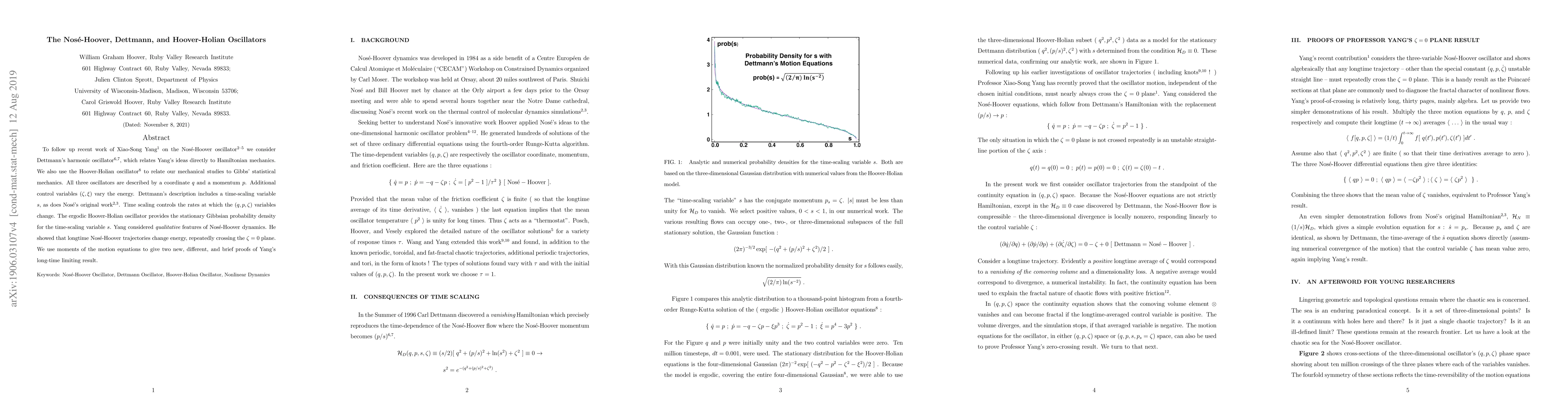 To follow up recent work of Xiao-Song Yang on the Nos\'e-Hoover oscillator we consider Dettmann's harmonic oscillator, which relates Yang's ideas directly to Hamiltonian mechanics. We also use the Hoover-Holian oscillator to relate our mechanical studies to Gibbs' statistical mechanics. All three oscillators are described by a coordinate $q$ and a momentum $p$. Additional control variables $(\zeta, \xi)$ vary the energy. Dettmann's description includes a time-scaling variable $s$, as does Nos\'e's original work. Time scaling controls the rates at which the $(q,p,\zeta)$ variables change. The ergodic Hoover-Holian oscillator provides the stationary Gibbsian probability density for the time-scaling variable $s$. Yang considered {\it qualitative} features of Nos\'e-Hoover dynamics. He showed that longtime Nos\'e-Hoover trajectories change energy, repeatedly crossing the $\zeta = 0$ plane. We use moments of the motion equations to give two new, different, and brief proofs of Yang's long-time limiting result.