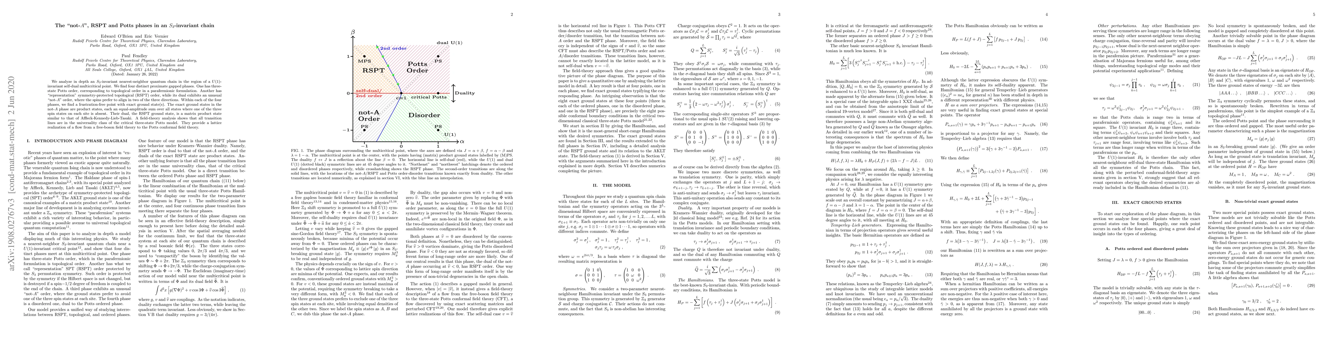 We analyse in depth an $S_3$-invariant nearest-neighbor quantum chain in the region of a U(1)-invariant self-dual multicritical point. We find four distinct proximate gapped phases. One has three-state Potts order, corresponding to topological order in a parafermionic formulation. Also nearby is a phase with "representation" symmetry-protected topological (RSPT) order. Its dual exhibits an unusual "not-A" order, where the spins prefer to align in two of the three directions. Within each of the four phases, we find a frustration-free point with exact ground state(s). The exact RSPT ground state is similar to that of Affleck-Kennedy-Lieb-Tasaki, whereas its dual states in the not-A phase are product states, each an equal-amplitude sum over all states where one of the three spin states on each site is absent. A field-theory analysis shows that all transitions are in the universality class of the critical three-state Potts model. They provide a lattice realization of a flow from a free-boson field theory to the Potts conformal field theory.
