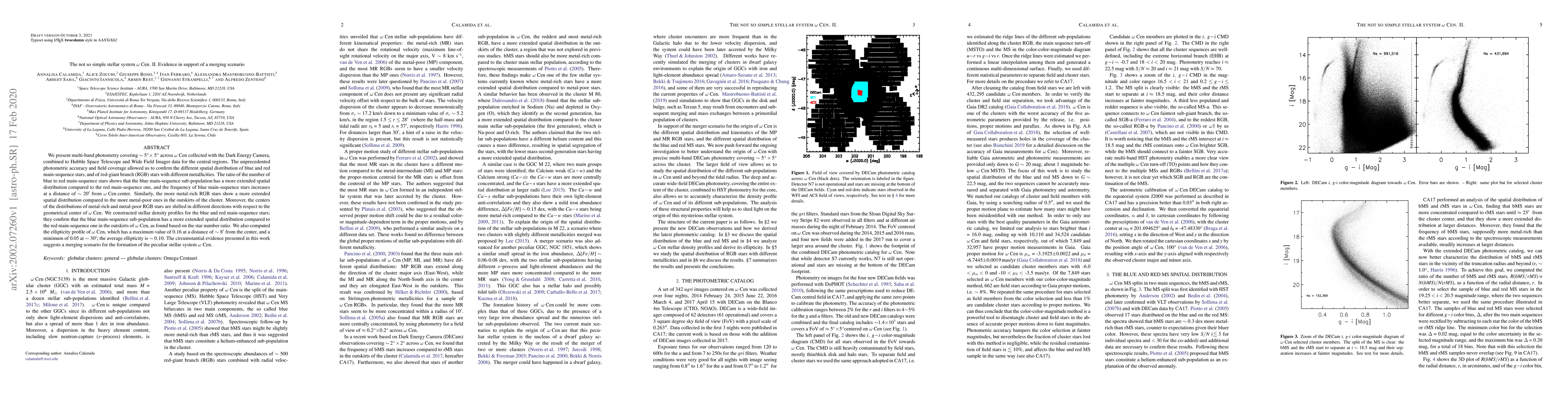 This paper uses multi-band photometry from the Dark Energy Camera, Hubble Space Telescope, and Wide Field Imager to analyze the spatial distribution of stars in Omega Centauri. It finds that blue and red main-sequence stars, as well as red-giant branch stars with different metallicities, have distinct spatial distributions, supporting a merging scenario for the formation of Omega Centauri.
