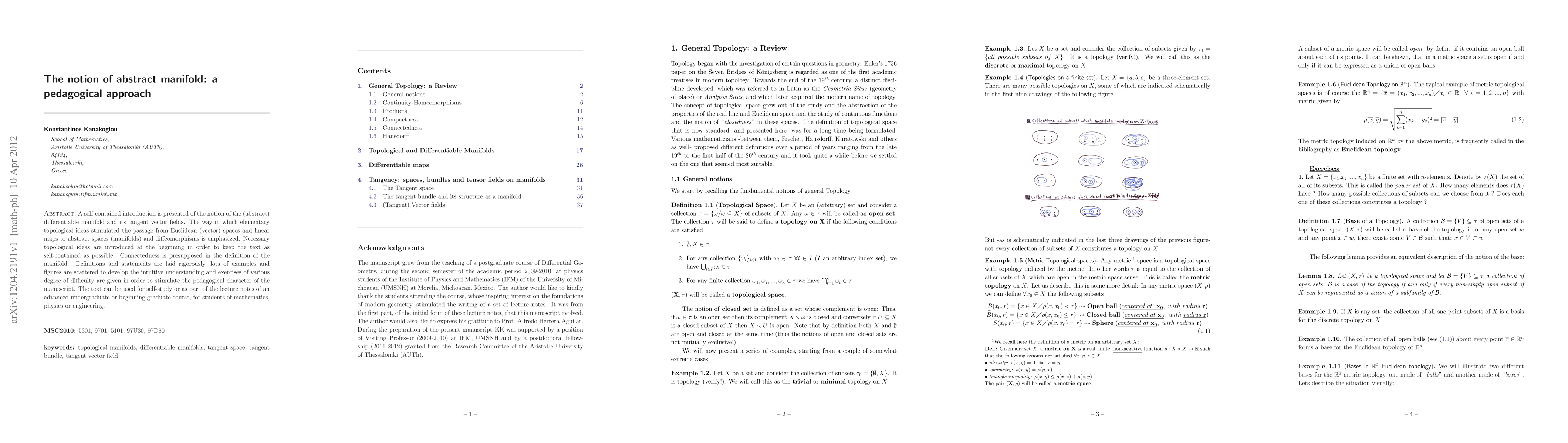 This paper introduces the concept of an abstract manifold, its tangent vector fields, and diffeomorphisms in a self-contained way, emphasizing the connection between elementary topological ideas and advanced mathematical concepts, making it suitable for undergraduate or graduate students.