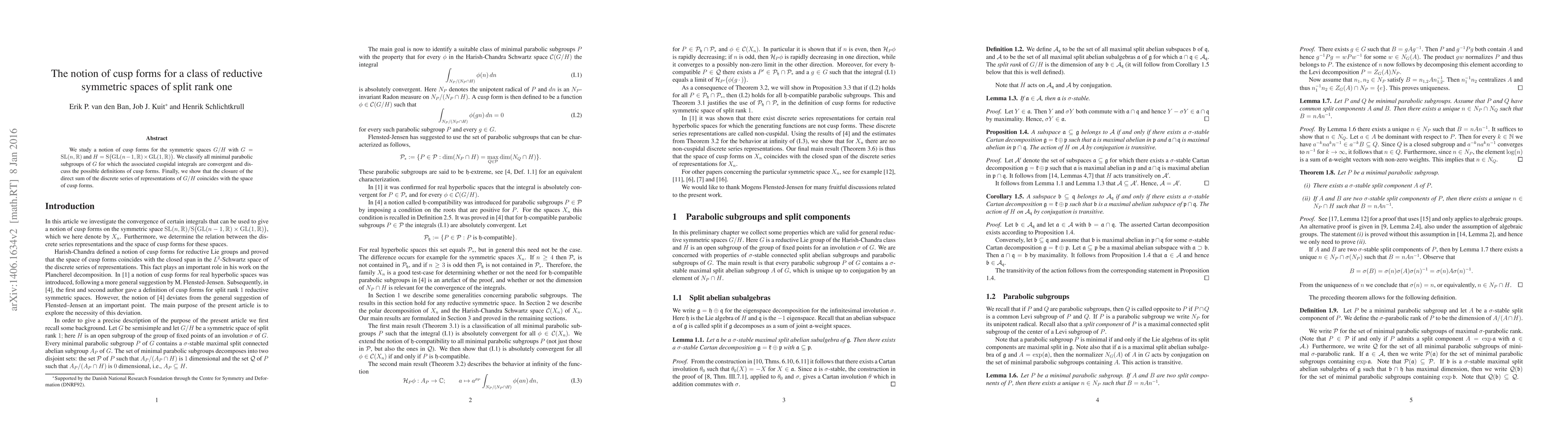 We study a notion of cusp forms for the symmetric spaces G/H with G = SL(n,R) and H = S(GL(n-1,R) x GL(1,R)). We classify all minimal parabolic subgroups of G for which the associated cuspidal integrals are convergent and discuss the possible definitions of cusp forms. Finally, we show that the closure of the direct sum of the discrete series of representations of G/H coincides with the space of cusp forms.