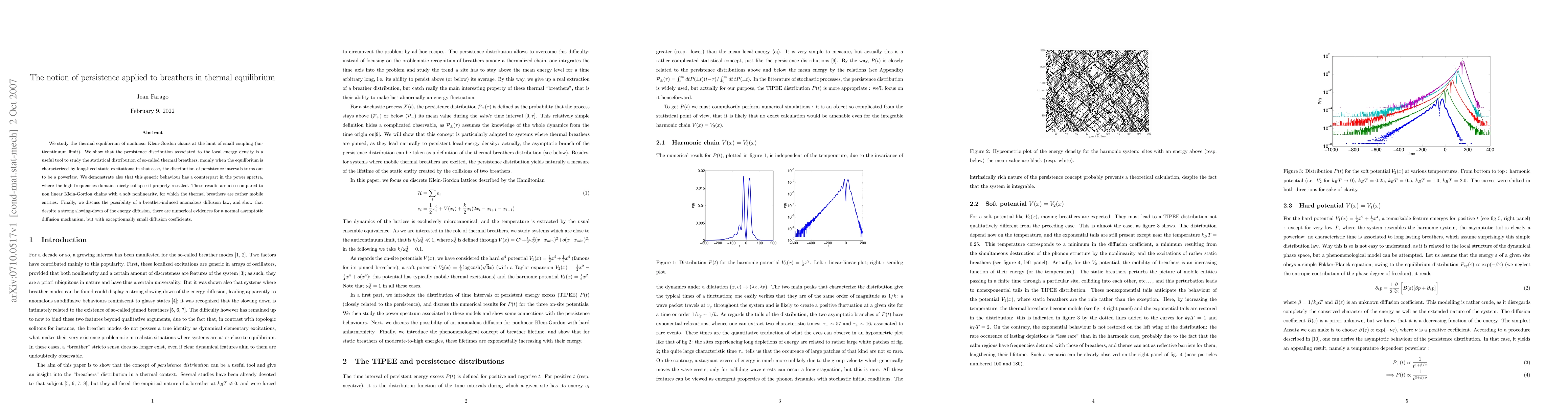 We study the thermal equilibrium of nonlinear Klein-Gordon chains at the limit of small coupling (anticontinuum limit). We show that the persistence distribution associated to the local energy density is a useful tool to study the statistical distribution of so-called thermal breathers, mainly when the equilibrium is characterized by long-lived static excitations; in that case, the distribution of persistence intervals turns out to be a powerlaw. We demonstrate also that this generic behaviour has a counterpart in the power spectra, where the high frequencies domains nicely collapse if properly rescaled. These results are also compared to non linear Klein-Gordon chains with a soft nonlinearity, for which the thermal breathers are rather mobile entities. Finally, we discuss the possibility of a breather-induced anomalous diffusion law, and show that despite a strong slowing-down of the energy diffusion, there are numerical evidences for a normal asymptotic diffusion mechanism, but with exceptionnally small diffusion coefficients.