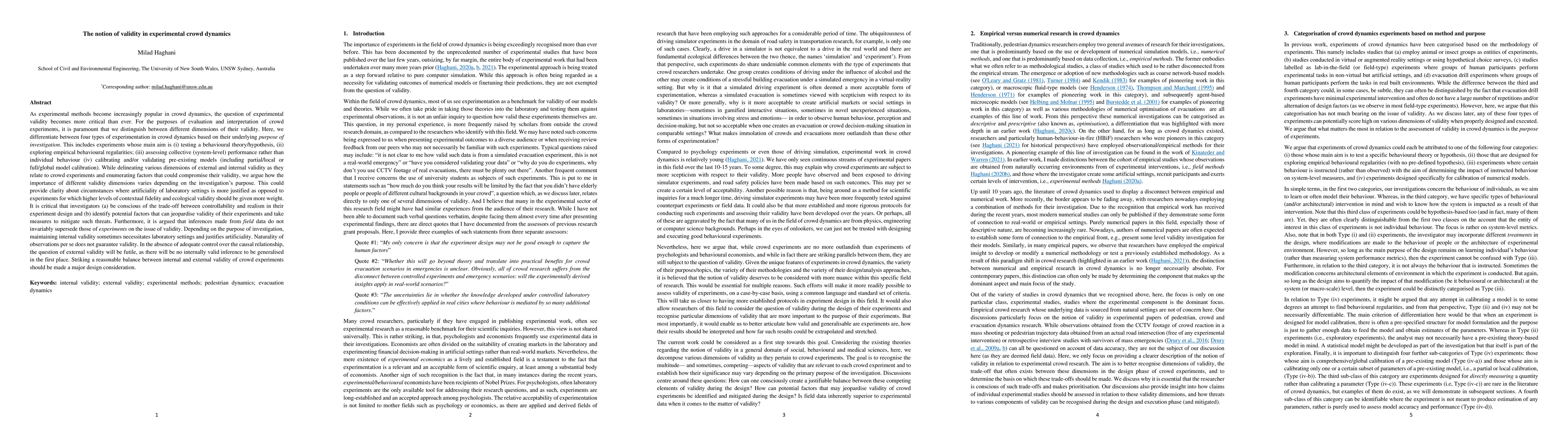 Research highlights the importance of distinguishing between different types of validity in experimental crowd dynamics experiments, such as testing a theory versus exploring empirical regularities, to ensure a balance between internal and external validity.