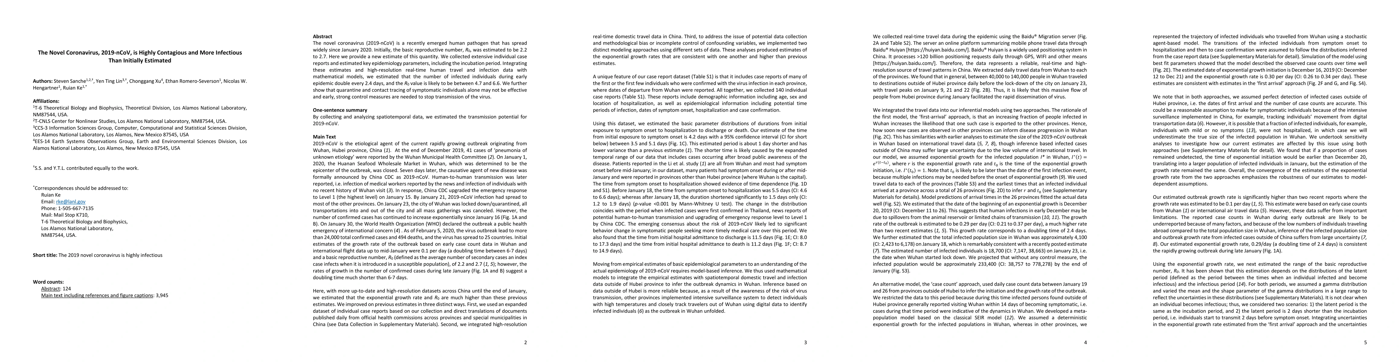 The novel coronavirus 2019-nCoV is highly contagious, with an estimated R0 value of 4.7-6.6, doubling in infected individuals every 2.4 days. Strong control measures are needed to stop transmission, as quarantine and contact tracing alone may not be effective.
