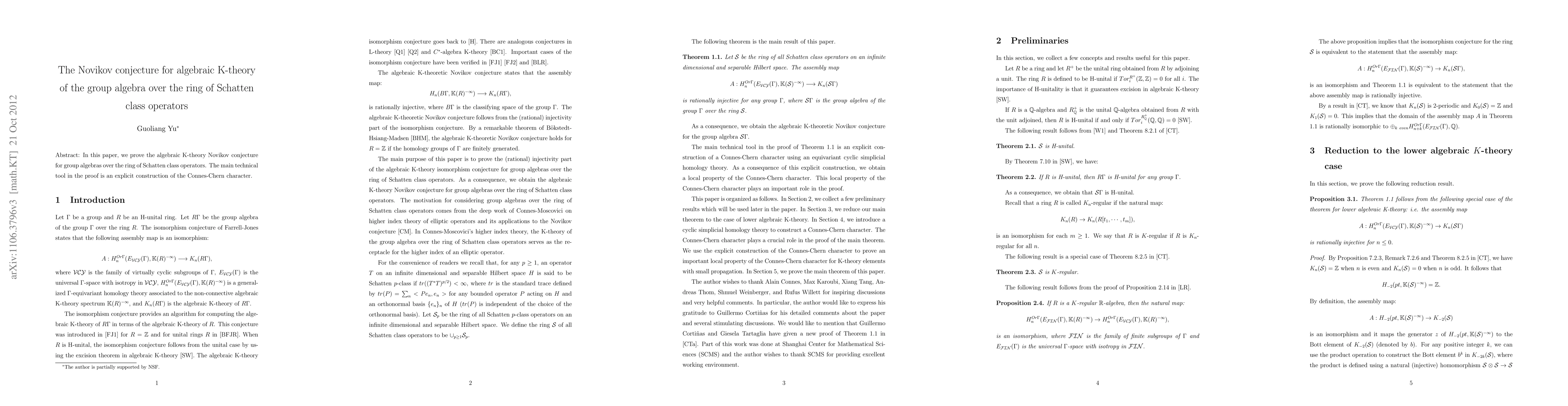 Summary: This paper proves the Novikov conjecture for algebraic K-theory concerning group algebras over the ring of Schatten class operators, utilizing an explicit construction of the Connes-Chern character as its primary technical tool.