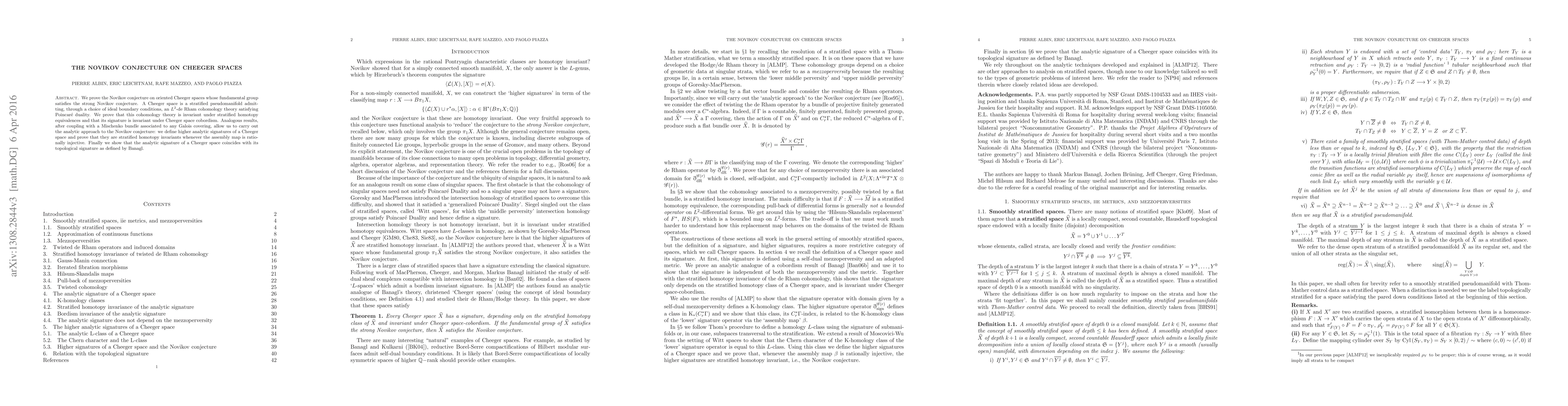 We prove the Novikov conjecture on oriented Cheeger spaces whose fundamental group satisfies the strong Novikov conjecture. A Cheeger space is a stratified pseudomanifold admitting, through a choice of ideal boundary conditions, an L2-de Rham cohomology theory satisfying Poincare duality. We prove that this cohomology theory is invariant under stratified homotopy equivalences and that its signature is invariant under Cheeger space cobordism. Analogous results, after coupling with a Mishchenko bundle associated to any Galois covering, allow us to carry out the analytic approach to the Novikov conjecture: we define higher analytic signatures of a Cheeger space and prove that they are stratified homotopy invariants whenever the assembly map is rationally injective. Finally we show that the analytic signature of a Cheeger space coincides with its topological signature as defined by Banagl.