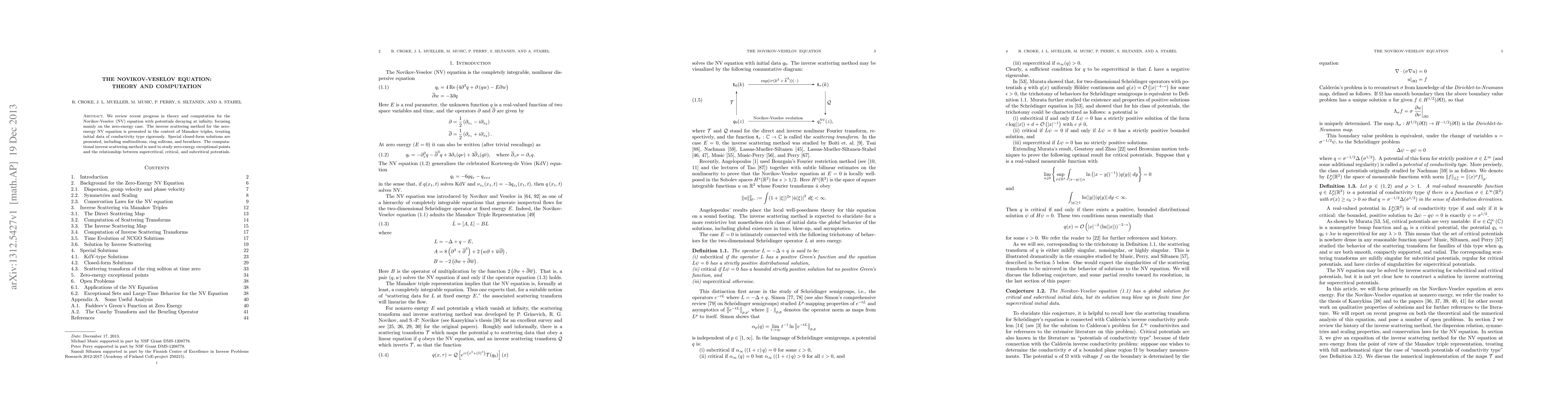 The Novikov-Veselov equation theory and computation review focuses on initial potentials decaying at infinity, zero-energy cases, and inverse scattering methods to study exceptional points and soliton solutions.