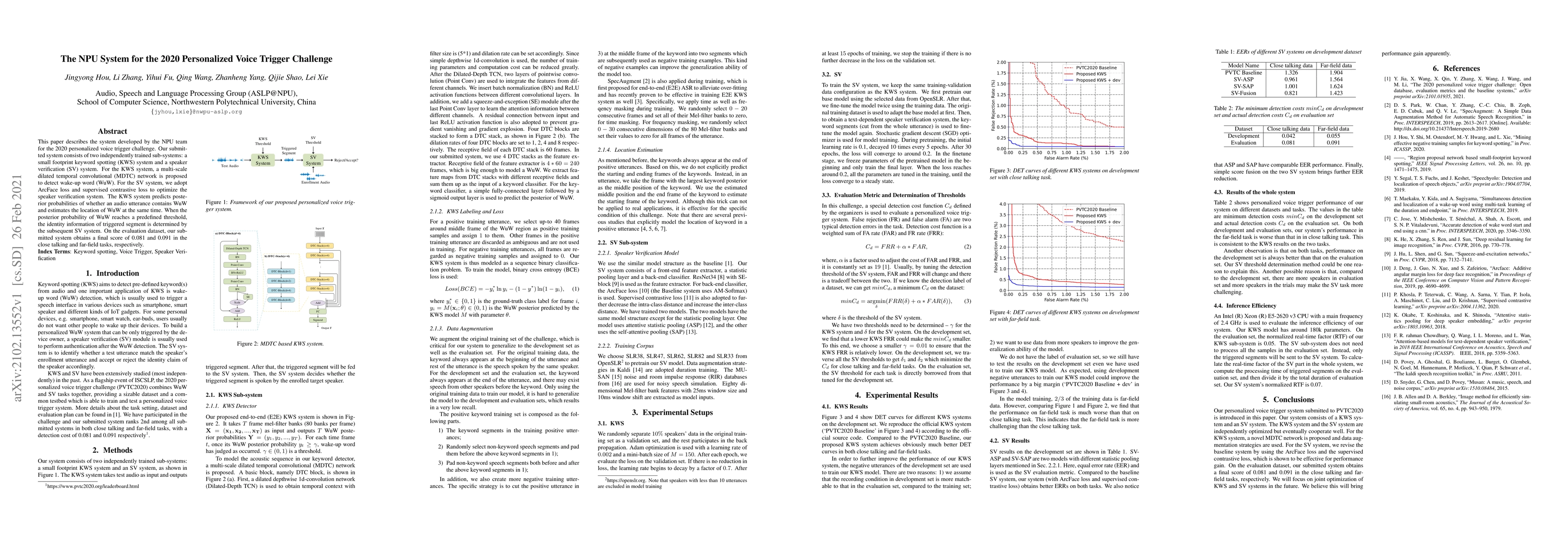The NPU team developed a dual-subsystem system for the 2020 personalized voice trigger challenge, combining a multi-scale dilated temporal convolutional network for wake-up word detection and a speaker verification system to identify the speaker. The system achieved detection costs of 0.081 and 0.091 in close talking and far-field tasks, respectively.