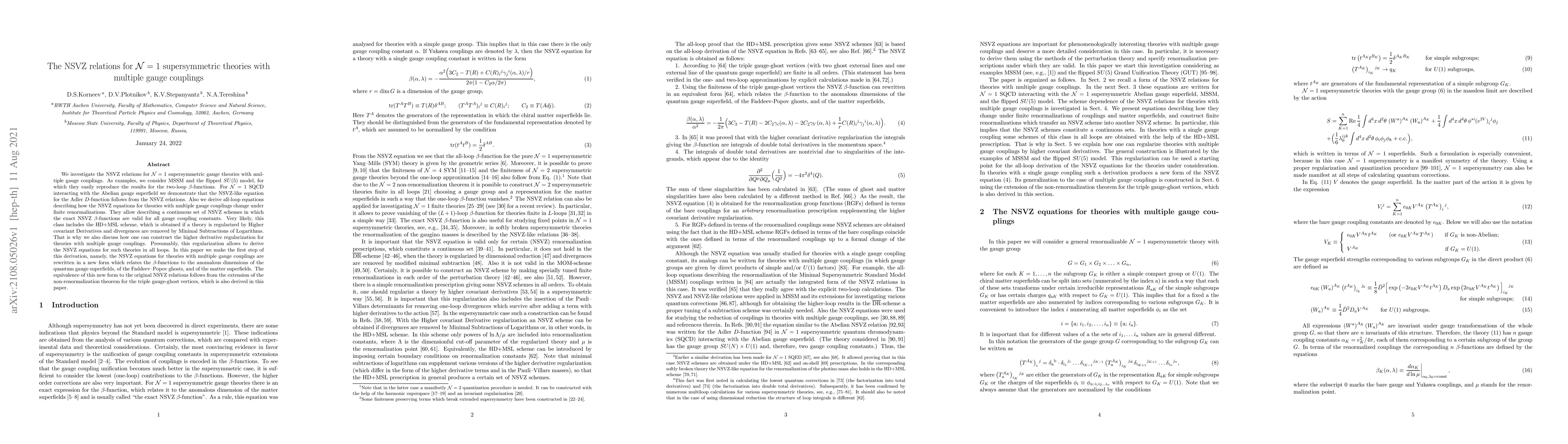 This paper investigates the NSVZ relations for ${\cal N}=1$ supersymmetric gauge theories with multiple gauge couplings, demonstrating their applicability to the MSSM and flipped $SU(5)$ model. It introduces a new form of NSVZ equations that relate $\beta$-functions to anomalous dimensions, and discusses higher derivative regularization methods for these theories.