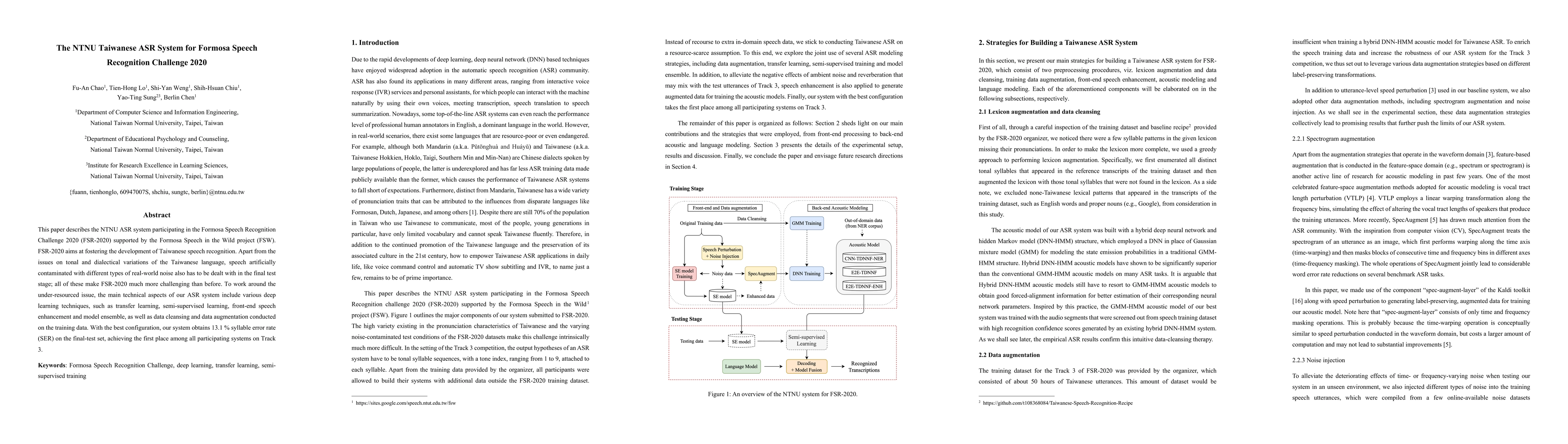 The paper presents a comprehensive NTNU Taiwanese ASR system incorporating various deep learning techniques, front-end speech enhancement, and data augmentation methods to tackle under-resourced speech recognition challenges.
