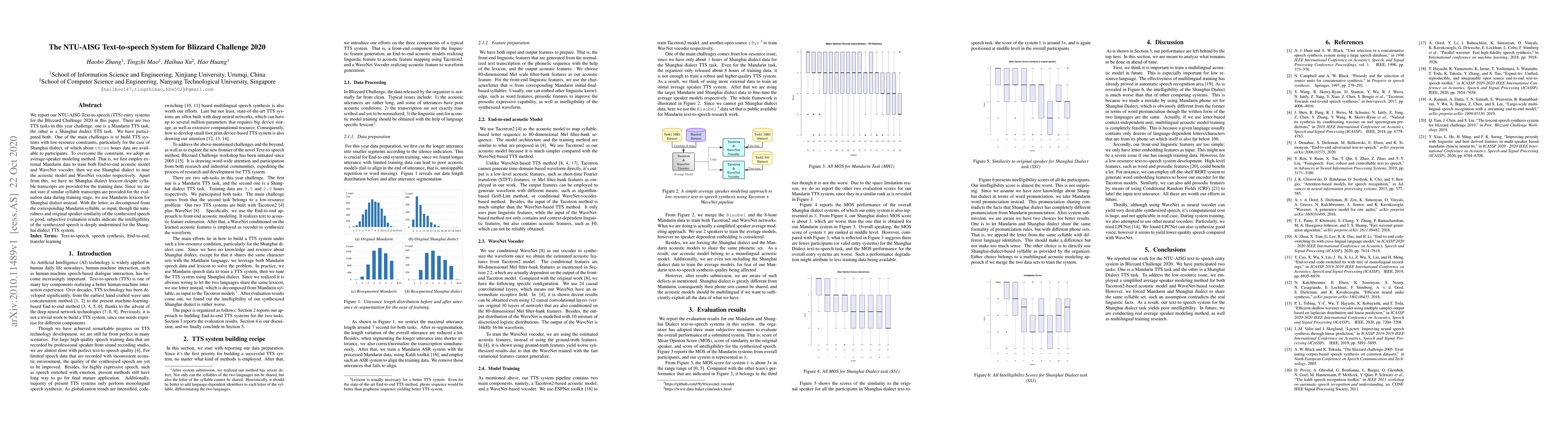 We report our NTU-AISG Text-to-speech (TTS) entry systems for the Blizzard Challenge 2020 in this paper. There are two TTS tasks in this year's challenge, one is a Mandarin TTS task, the other is a Shanghai dialect TTS task. We have participated both. One of the main challenges is to build TTS systems with low-resource constraints, particularly for the case of Shanghai dialect, of which about three hours data are available to participants. To overcome the constraint, we adopt an average-speaker modeling method. That is, we first employ external Mandarin data to train both End-to-end acoustic model and WaveNet vocoder, then we use Shanghai dialect to tune the acoustic model and WaveNet vocoder respectively. Apart from this, we have no Shanghai dialect lexicon despite syllable transcripts are provided for the training data. Since we are not sure if similar syllable transcripts are provided for the evaluation data during the training stage, we use Mandarin lexicon for Shanghai dialect instead. With the letter, as decomposed from the corresponding Mandarin syllable, as input, though the naturalness and original speaker similarity of the synthesized speech are good, subjective evaluation results indicate the intelligibility of the synthesized speech is deeply undermined for the Shanghai dialect TTS system.