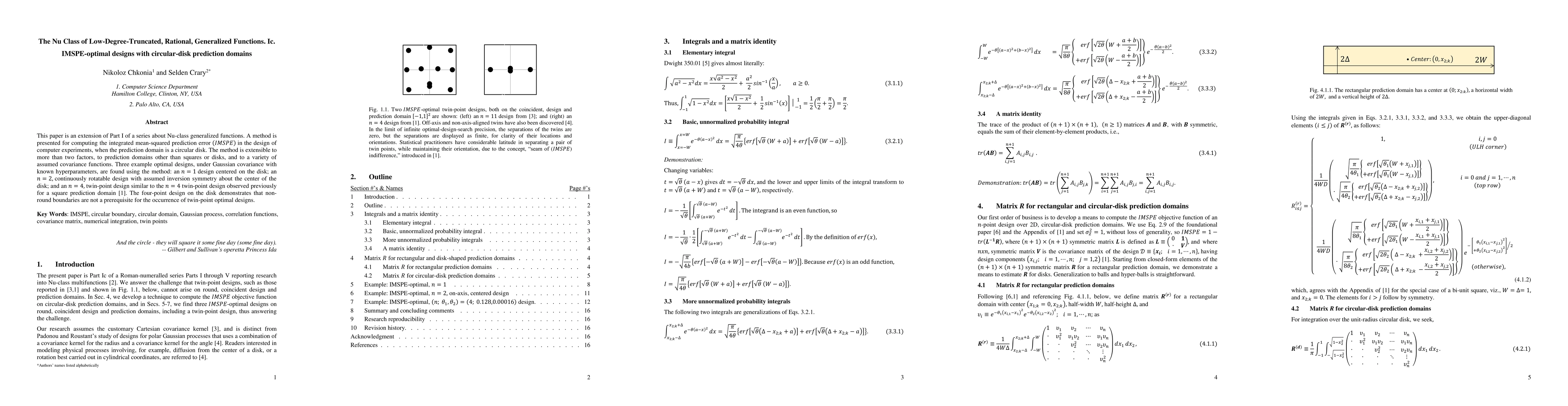 This paper extends research on Nu-class multifunctions by developing a method for computing integrated mean-squared prediction error in computer experiments with circular-disk prediction domains, demonstrating optimal designs for Gaussian covariance and showing that twin-point designs can occur without round boundaries.