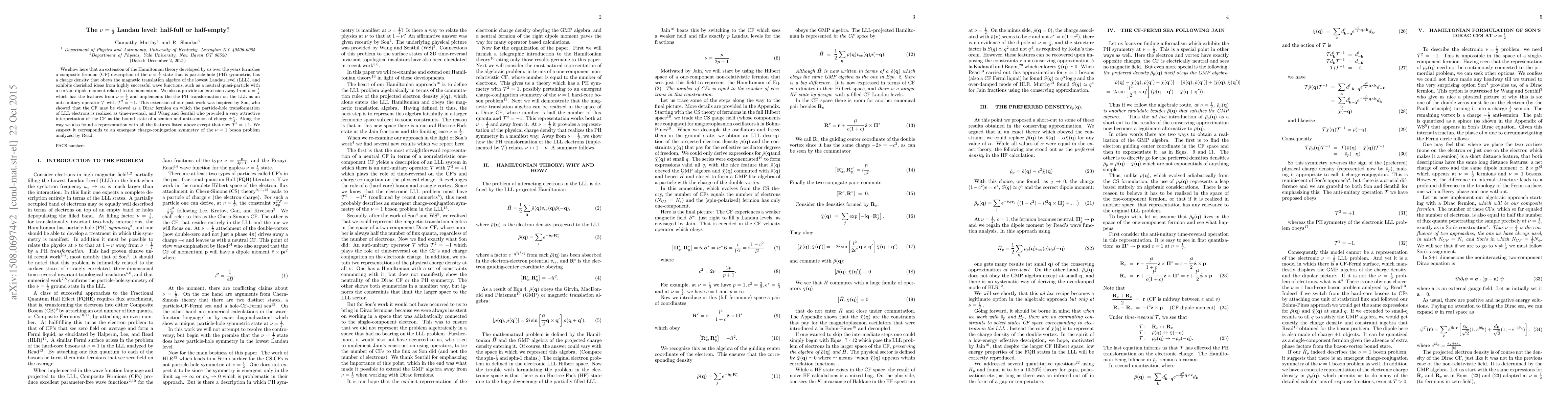 We show here that an extension of the Hamiltonian theory developed by us over the years furnishes a composite fermion (CF) description of the $\nu =\frac{1}{2}$ state that is particle-hole (PH) symmetric, has a charge density that obeys the magnetic translation algebra of the lowest Landau level (LLL), and exhibits cherished ideas from highly successful wave functions, such as a neutral quasi-particle with a certain dipole moment related to its momentum. We also a provide an extension away from $\nu=\frac{1}{2}$ which has the features from $\nu=\frac{1}{2}$ and implements the the PH transformation on the LLL as an anti-unitary operator ${\cal T}$ with ${\cal T}^2=-1$. This extension of our past work was inspired by Son, who showed that the CF may be viewed as a Dirac fermion on which the particle-hole transformation of LLL electrons is realized as time-reversal, and Wang and Senthil who provided a very attractive interpretation of the CF as the bound state of a semion and anti-semion of charge $\pm {e\over 2}$. Along the way we also found a representation with all the features listed above except that now ${\cal T}^2=+1$. We suspect it corresponds to an emergent charge-conjugation symmetry of the $\nu =1$ boson problem analyzed by Read.