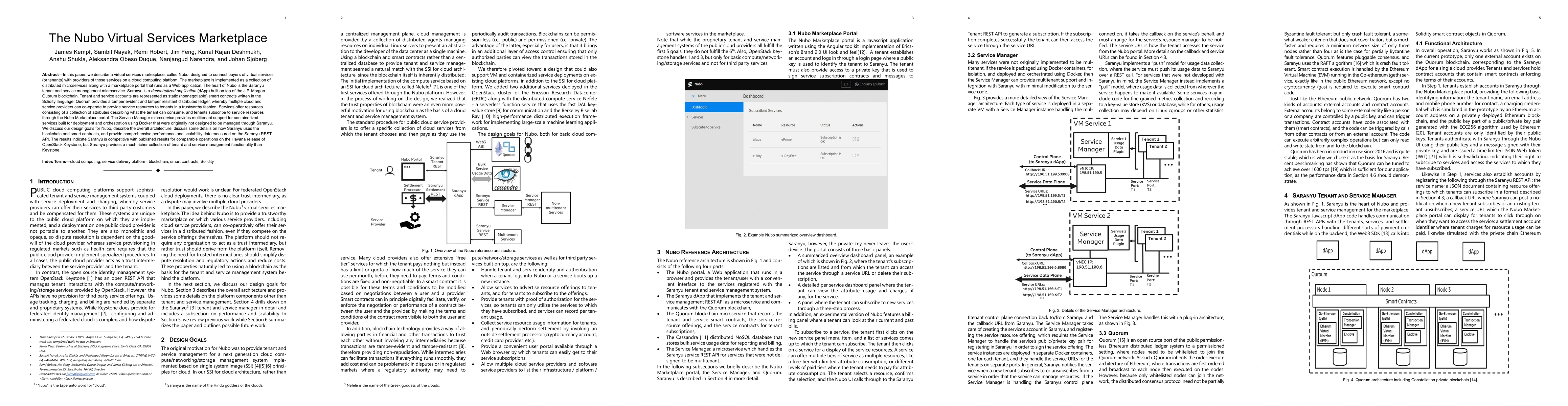 The Nubo virtual services marketplace connects cloud service buyers with providers through a decentralized blockchain-based microservice architecture, offering robust tenant and service management capabilities, and demonstrating competitive performance against OpenStack Keystone. Saranyu, a key decentralized application on the J.P. Morgan Quorum blockchain, underpins the marketplace with tamper-evident smart contracts.