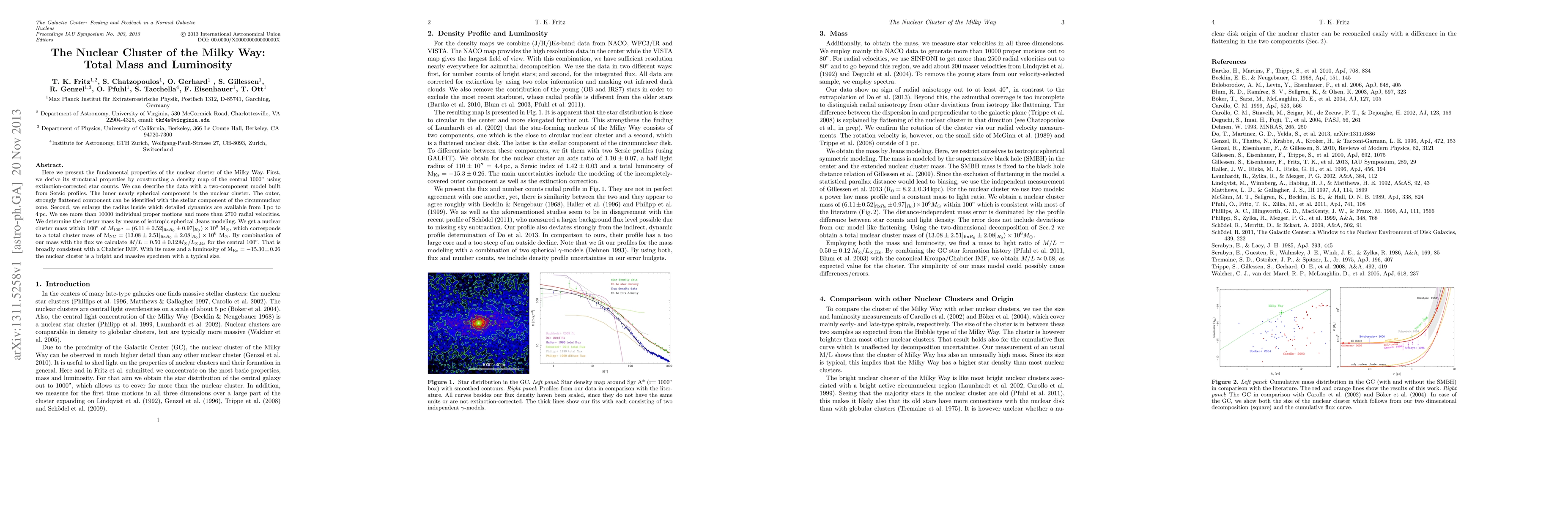 Here we present the fundamental properties of the nuclear cluster of the Milky Way. First, we derive its structural properties by constructing a density map of the central 1000'' using extinction-corrected star counts. We can describe the data with a two-component model built from Sersic profiles. The inner nearly spherical component is the nuclear cluster. The outer, strongly flattened component can be identified with the stellar component of the circumnuclear zone. Second, we enlarge the radius inside which detailed dynamics are available from $1\,$pc to $4\,$pc. We use more than 10000 individual proper motions and more than 2700 radial velocities. We determine the cluster mass by means of isotropic spherical Jeans modeling. We get a nuclear cluster mass within 100'' of $M_{100''}=(6.11 \pm 0.52|_{\mathrm{fix} R_0}\pm 0.97|_{R_0}) \times 10^6 $ M$_{\odot}$, which corresponds to a total cluster mass of M$_{\mathrm{NC}}=(13.08 \pm 2.51|_{\mathrm{fix} R_0}\pm 2.08|_{R_0}) \times 10^6 $ M$_{\odot}$. By combination of our mass with the flux we calculate $M/L=0.50 \pm 0.12 M_{\odot}/L_{\odot,\mathrm{Ks}}$ for the central 100''. That is broadly consistent with a Chabrier IMF. With its mass and a luminosity of M$_{\mathrm{Ks}}=-15.30\pm0.26$ the nuclear cluster is a bright and massive specimen with a typical size.