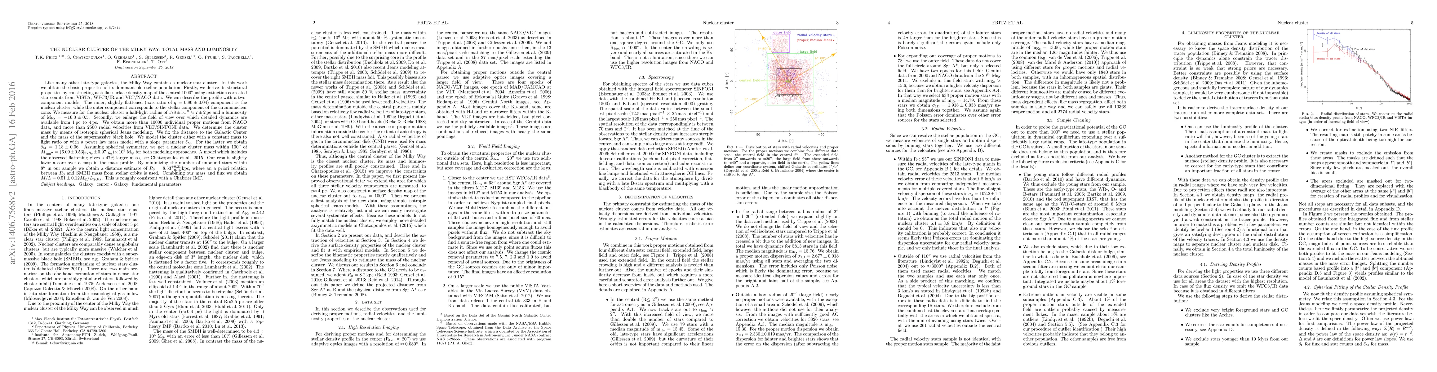 Like many other late-type galaxies, the Milky Way contains a nuclear star cluster. In this work we obtain the basic properties of its dominant old stellar population. Firstly, we derive its structural properties by constructing a stellar surface density map of the central 1000" using extinction corrected star counts from VISTA, WFC3/IR and VLT/NACO data. We can describe the profile with a two-component model. The inner, slightly flattened (q=0.80+/-0.04) component is the nuclear cluster, while the outer component corresponds to the stellar component of the circumnuclear zone. We measure for the nuclear cluster a half-light radius of 178+/-51"~7+/-2 pc and a luminosity of M_Ks=-16.0+/-0.5. Secondly, we enlarge the range over which detailed dynamics are available from 1 pc to 4 pc. We obtain more than 10000 individual proper motions from NACO data, and more than 2500 radial velocities from VLT/SINFONI data. We determine the cluster mass by means of isotropic spherical Jeans modeling. We fix the distance to the Galactic Center and the mass of the supermassive black hole. We model the cluster either with a constant mass to light ratio or with a power law mass model. For the latter we obtain a slope of delta_M=1.18+/-0.06. Assuming spherical symmetry, we get a nuclear cluster mass within 100" of M_100"=6.09+/- 0.53_(fix_R_0) +/- 0.97_(R_0) * 10^6 M_sun for both modeling approaches. A model which includes the observed flattening gives a 47% larger mass, see Chatzopoulos et al. 2015. Our results slightly favor a core over a cusp in the mass profile. By minimizing the number of unbound stars within 8" in our sample we obtain a distance estimate of R$_0=8.53^{+0.21}_{-0.15}$ kpc, where an a priori relation between R_0 and SMBH mass from stellar orbits is used. Combining our mass and flux we obtain M/L=0.51+/-0.12 M_sun/L_(sun Ks). This is roughly consistent with a Chabrier IMF.