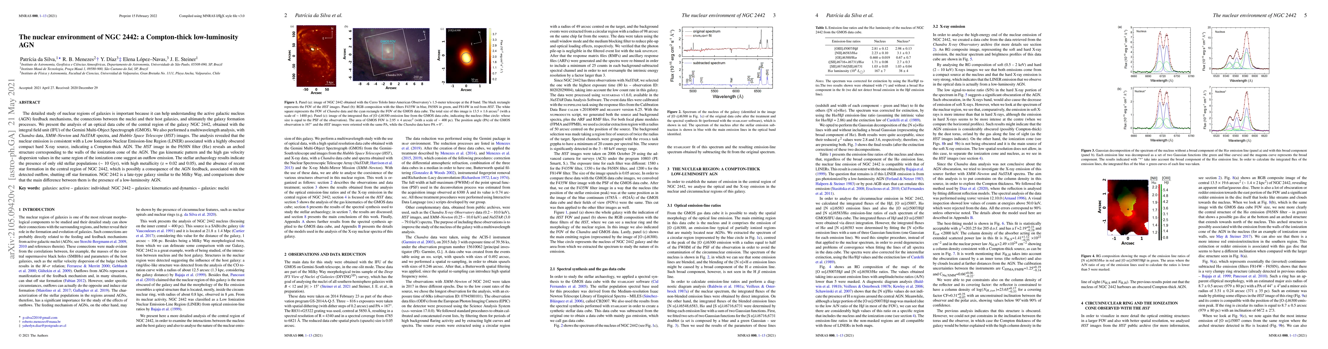 The detailed study of nuclear regions of galaxies is important because it can help understanding the active galactic nucleus (AGN) feedback mechanisms, the connections between the nuclei and their host galaxies, and ultimately the galaxy formation processes. We present the analysis of an optical data cube of the central region of the galaxy NGC 2442, obtained with the integral field unit (IFU) of the Gemini Multi-Object Spectrograph (GMOS). We also performed a multiwavelength analysis, with Chandra data, XMM--Newton and NuSTAR spectra, and Hubble Space Telescope (HST) images. The analysis revealed that the nuclear emission is consistent with a Low Ionization Nuclear Emission-line Region (LINER) associated with a highly obscured compact hard X-ray source, indicating a Compton-thick AGN. The HST image in the F658N filter (H$\alpha$) reveals an arched structure corresponding to the walls of the ionization cone of the AGN. The gas kinematic pattern and the high gas velocity dispersion values in the same region of the ionization cone suggest an outflow emission. The stellar archaeology results indicate the presence of only old stellar populations ($\sim$ 10 Gyr), with high metallicity (z = 0.02 and 0.05), and the absence of recent star formation in the central region of NGC 2442, which is possibly a consequence of the AGN feedback, associated with the detected outflow, shutting off star formation. NGC 2442 is a late-type galaxy similar to the Milky Way, and comparisons show that the main difference between them is the presence of a low-luminosity AGN.