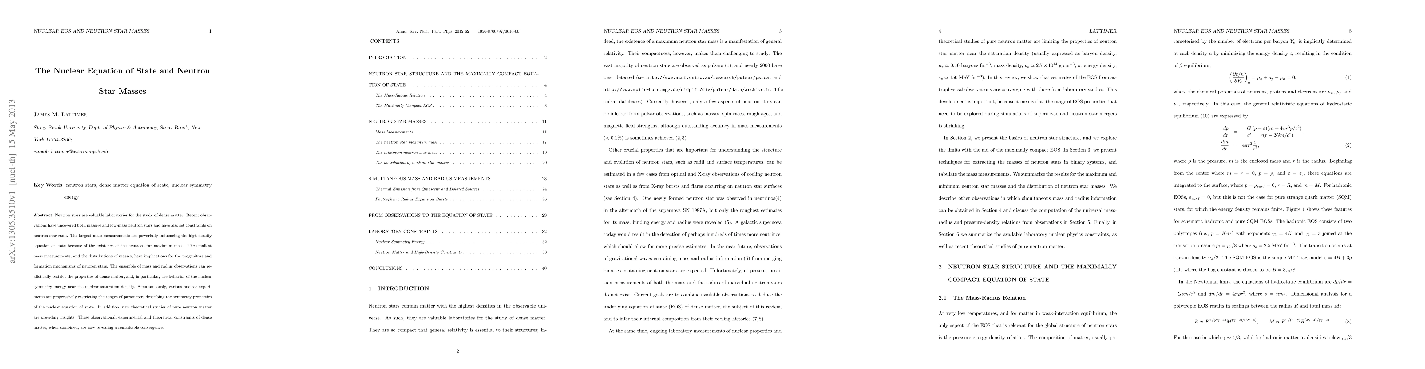 Neutron stars are valuable laboratories for the study of dense matter. Recent observations have uncovered both massive and low-mass neutron stars and have also set constraints on neutron star radii. The largest mass measurements are powerfully influencing the high-density equation of state because of the existence of the neutron star maximum mass. The smallest mass measurements, and the distributions of masses, have implications for the progenitors and formation mechanisms of neutron stars. The ensemble of mass and radius observations can realistically restrict the properties of dense matter, and, in particular, the behavior of the nuclear symmetry energy near the nuclear saturation density. Simultaneously, various nuclear experiments are progressively restricting the ranges of parameters describing the symmetry properties of the nuclear equation of state. In addition, new theoretical studies of pure neutron matter are providing insights. These observational, experimental and theoretical constraints of dense matter, when combined, are now revealing a remarkable convergence.