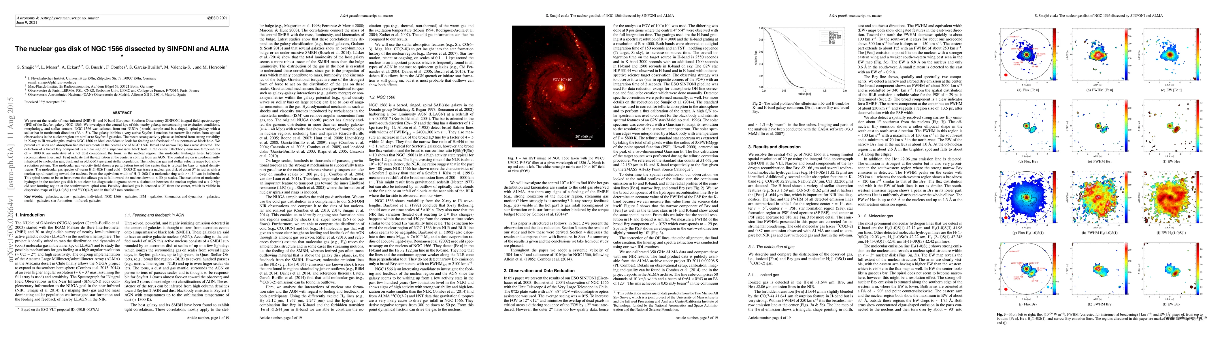 We present the results of near-infrared H- and K-band European Southern Observatory SINFONI integral field spectroscopy of the Seyfert galaxy NGC 1566. We investigate the central kpc of this nearby galaxy, concentrating on excitation conditions, morphology, and stellar content. NGC 1566 was selected from our NUGA (-south) sample and is a ringed, spiral galaxy with a stellar bar. We present emission and absorption line measurements in the central kpc of NGC 1566. Broad and narrow Br{\gamma} lines were detected. The detection of a broad Br{\gamma} component is a clear sign of a super-massive black hole in the center. Blackbody emission temperatures of ~1000 K are indicative of a hot dust component, the torus, in the nuclear region. The molecular hydrogen lines, hydrogen recombination lines, and [FeII] indicate that the excitation at the center is coming from an AGN. The central region is predominantly inhabited by molecular gas, dust, and an old K-M type giant stellar population. The molecular gas and stellar velocity maps both show a rotation pattern. The molecular gas velocity field shows a perturbation toward the center that is typical for bars or spiral density waves. The molecular gas species of warm H_2(1-0)S(1) and cold ^{12}CO(3-2) gas trace a nuclear gas disk of about 3" in radius with a nuclear spiral reaching toward the nucleus. From the equivalent width of H_2(1-0)S(1) a molecular ring with r<~3" can be inferred. This spiral seems to be an instrument that allows gas to fall toward the nucleus down to <50 pc scales. The excitation of molecular hydrogen in the nuclear gas disk is not clear but diagnostic diagrams show a distinction between the nuclear region and a <9 Myr old star forming region at the southwestern spiral arm. Possibly shocked gas is detected ~2" from the center, which is visible in dispersion maps of H$_2$(1-0)S(1) and ^{12}CO(3-2) and in the 0.87 mm continuum.