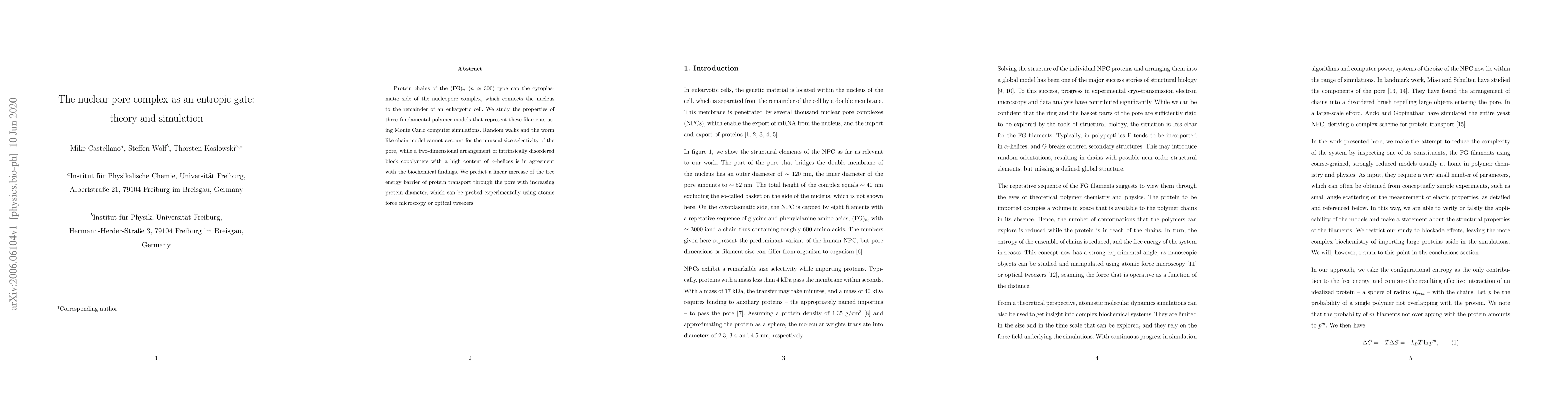 Protein chains of the (FG)$_n$ ($n \simeq$ 300) type cap the cytoplasmatic side of the nucleopore complex, which connects the nucleus to the remainder of an eukaryotic cell. We study the properties of three fundamental polymer models that represent these filaments using Monte Carlo computer simulations. Random walks and the worm like chain model cannot account for the unusual size selectivity of the pore, while a two-dimensional arrangement of intrinsically disordered block copolymers with a high content of $\alpha$-helices is in agreement with the biochemical findings. We predict a linear increase of the free energy barrier of protein transport through the pore with increasing protein diameter, which can be probed experimentally using atomic force microscopy or optical tweezers.