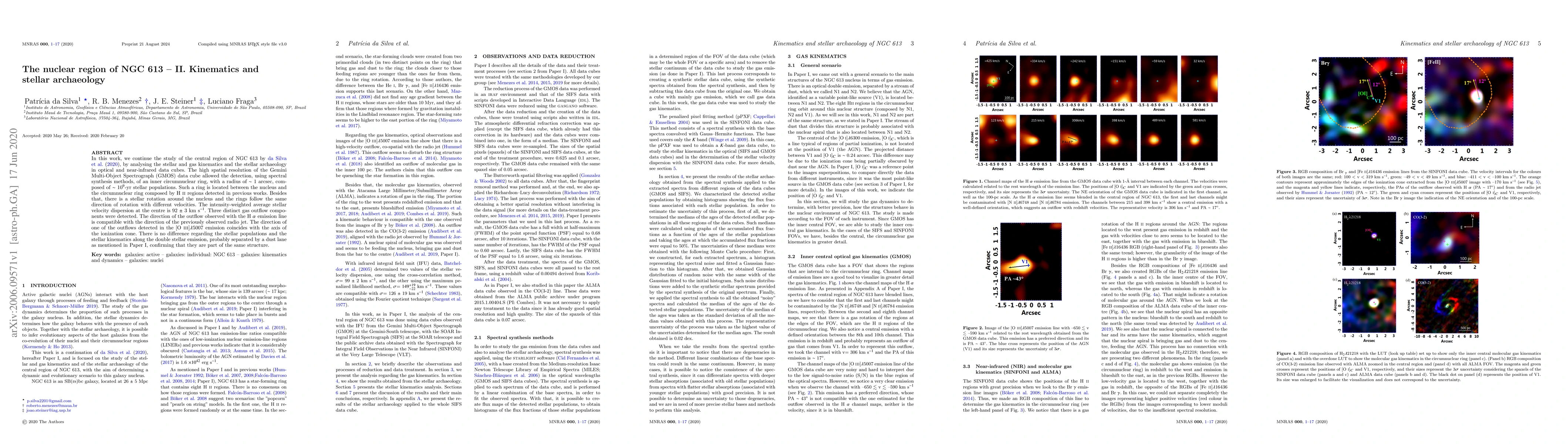 In this work, we continue the study of the central region of NGC 613 by da Silva et al. (2020), by analysing the stellar and gas kinematics and the stellar archaeology in optical and near-infrared data cubes. The high spatial resolution of the Gemini Multi-Object Spectrograph (GMOS) data cube allowed the detection, using spectral synthesis methods, of an inner circumnuclear ring, with a radius of $\sim$ 1 arcsec, composed of $\sim$ 10$^9$-yr stellar populations. Such a ring is located between the nucleus and the circumnuclear ring composed by H II regions detected in previous works. Besides that, there is a stellar rotation around the nucleus and the rings follow the same direction of rotation with different velocities. The intensity-weighted average stellar velocity dispersion at the centre is 92 $\pm$ 3 km s$^{-1}$. Three distinct gas outflow components were detected. The direction of the outflow observed with the H $\alpha$ emission line is compatible with the direction of the previously observed radio jet. The direction of one of the outflows detected in the [O III]$\lambda$5007 emission coincides with the axis of the ionization cone. There is no difference regarding the stellar populations and the stellar kinematics along the double stellar emission, probably separated by a dust lane as mentioned in Paper I, confirming that they are part of the same structure.