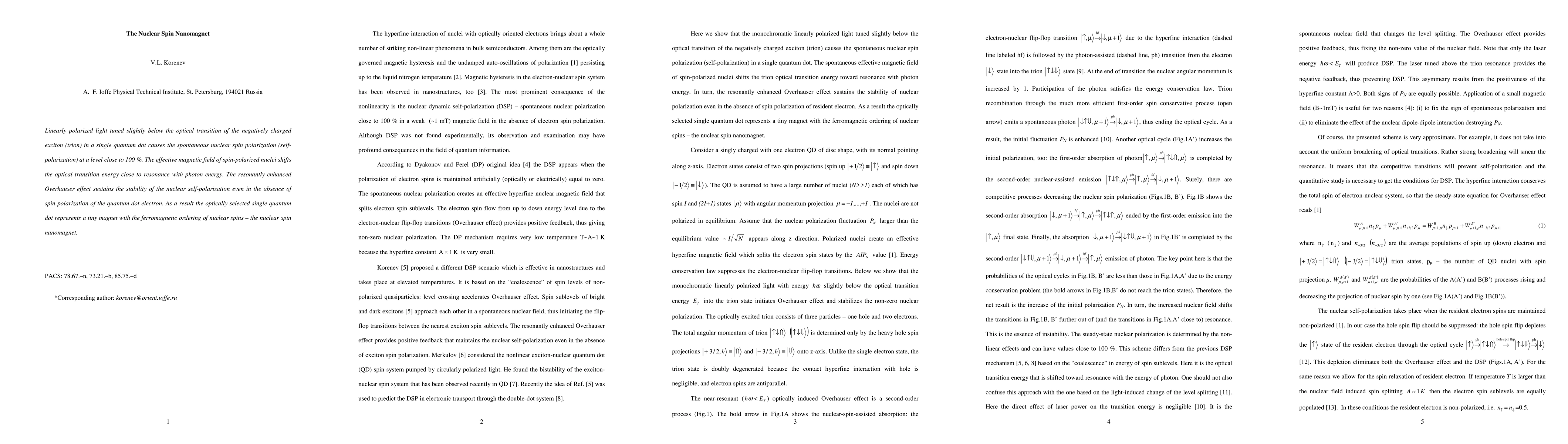 This paper demonstrates that linearly polarized light can induce nearly complete nuclear spin polarization in a single quantum dot, creating a nuclear spin nanomagnet. The resonantly enhanced Overhauser effect maintains this polarization even without electron spin polarization, showcasing a tiny magnet with ferromagnetically ordered nuclear spins.