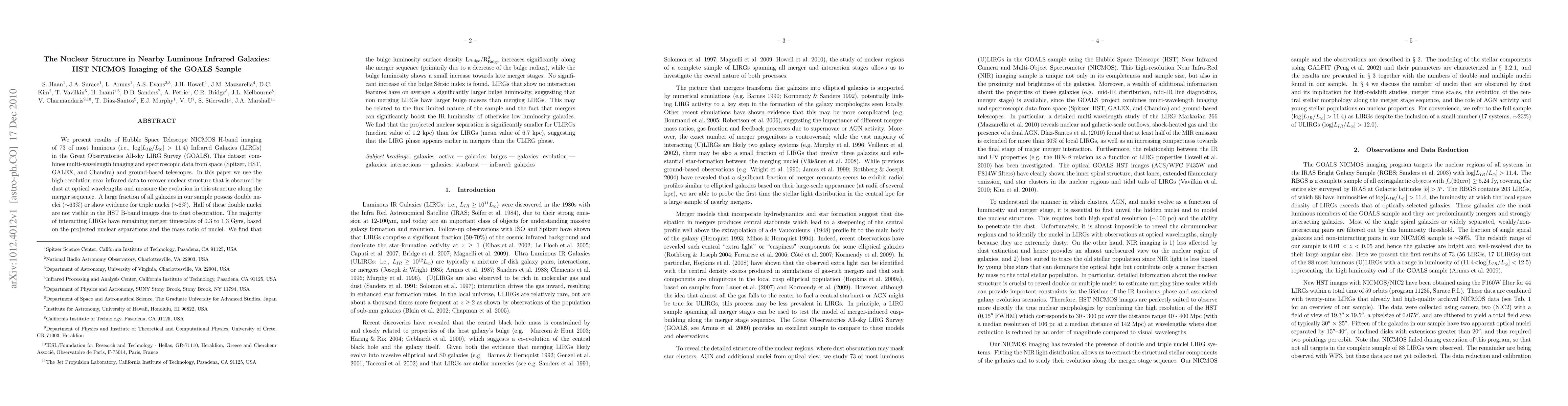 This paper uses HST NICMOS imaging to study the nuclear structure of 73 luminous infrared galaxies (LIRGs) in the GOALS sample, revealing that ~63% possess double nuclei, often obscured by dust. The study finds that the bulge luminosity surface density increases significantly along the merger sequence, indicating that non-merging LIRGs tend to have larger bulge masses compared to merging ones.