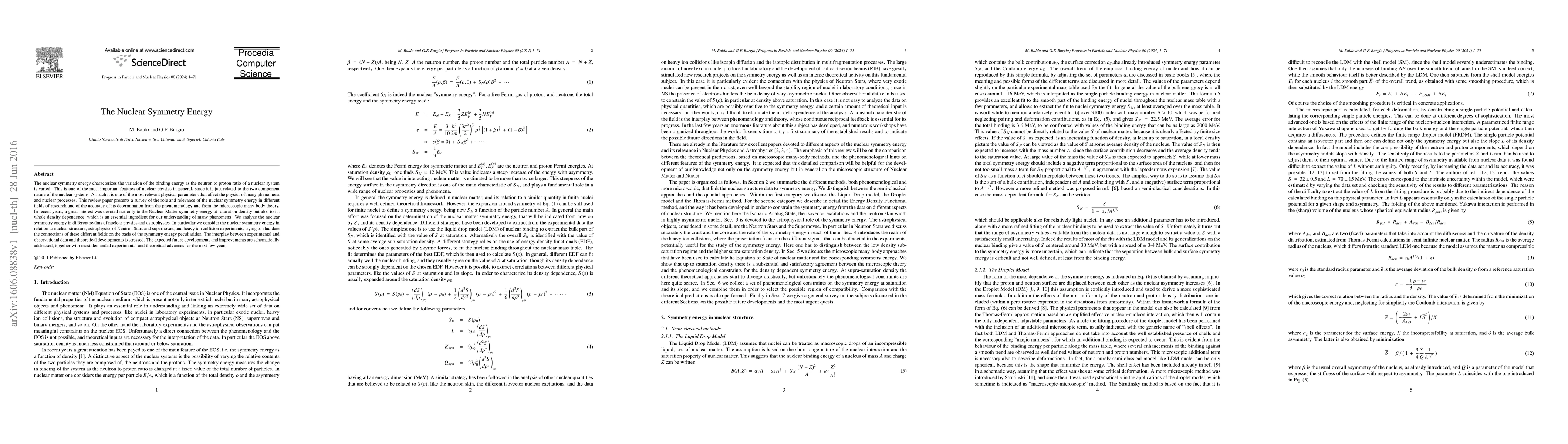 The nuclear symmetry energy characterizes the variation of the binding energy as the neutron to proton ratio of a nuclear system is varied. This is one of the most important features of nuclear physics in general, since it is just related to the two component nature of the nuclear systems. As such it is one of the most relevant physical parameters that affect the physics of many phenomena and nuclear processes. This review paper presents a survey of the role and relevance of the nuclear symmetry energy in different fields of research and of the accuracy of its determination from the phenomenology and from the microscopic many-body theory. In recent years, a great interest was devoted not only to the Nuclear Matter symmetry energy at saturation density but also to its whole density dependence, which is an essential ingredient for our understanding of many phenomena. We analyze the nuclear symmetry energy in different realms of nuclear physics and astrophysics. In particular we consider the nuclear symmetry energy in relation to nuclear structure, astrophysics of Neutron Stars and supernovae, and heavy ion collision experiments, trying to elucidate the connections of these different fields on the basis of the symmetry energy peculiarities. The interplay between experimental and observational data and theoretical developments is stressed. The expected future developments and improvements are schematically addressed, together with most demanded experimental and theoretical advances for the next few years.