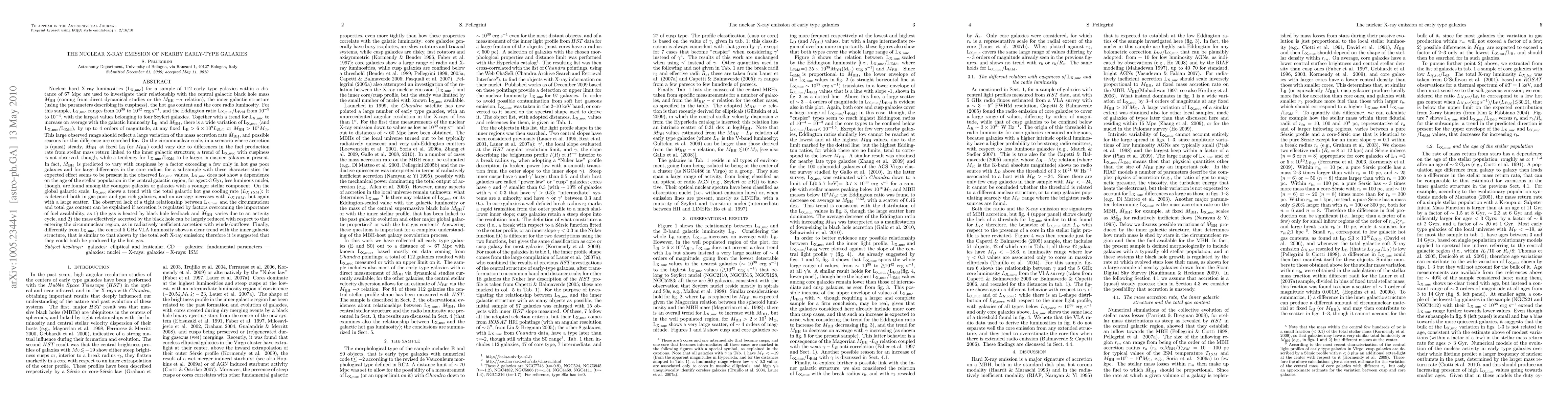 Nuclear hard X-ray luminosities (Lx,nuc) for a sample of 112 early type galaxies within a distance of 67 Mpc are used to investigate their relationship with the central galactic black hole mass Mbh, the inner galactic structure (using the parameters describing its cuspiness), the age of the stellar population in the central galactic region, the hot gas content and the core radio luminosity. Lx,nuc ranges from 10^{38} to 10^{42} erg/s, and the Eddington ratio Lx,nuc/Ledd from 10^{-9} to 10^{-4}. Lx,nuc increases on average with the galactic luminosity Lb and Mbh, with a wide variation by up to 4 orders of magnitude at any fixed Lb>6x10^9 Lb,sun or Mbh>10^7 Msun. This large range should reflect a large variation of the mass accretion rate \dotMbh. On the circumnuclear scale, \dotMbh at fixed Lb (or Mbh) could vary due to differences in the fuel production rate from the stellar mass return linked to the inner galactic structure; however, \dotMbh should vary with cuspiness by a factor exceeding a few only in hot gas poor galaxies and for large differences in the core radius. Lx,nuc does not depend on age, but less luminous nuclei are found among galaxies with a younger stellar component. Lx,nuc is detected both in gas poor and gas rich galaxies, on average increases with the total galactic hot gas cooling rate L_{X,ISM}, but again with a large variation. The lack of a tight relationship between Lx,nuc and the circumnuclear and total gas content can be explained if the gas is heated by black hole feedback, and/or the mass effectively accreted can be largely reduced with respect to that entering the circumnuclear region. Differently from Lx,nuc, the 5 GHz VLA luminosity shows a trend with the inner galactic structure similar to that of the total soft X-ray emission; therefore they could both be produced by the hot gas.
