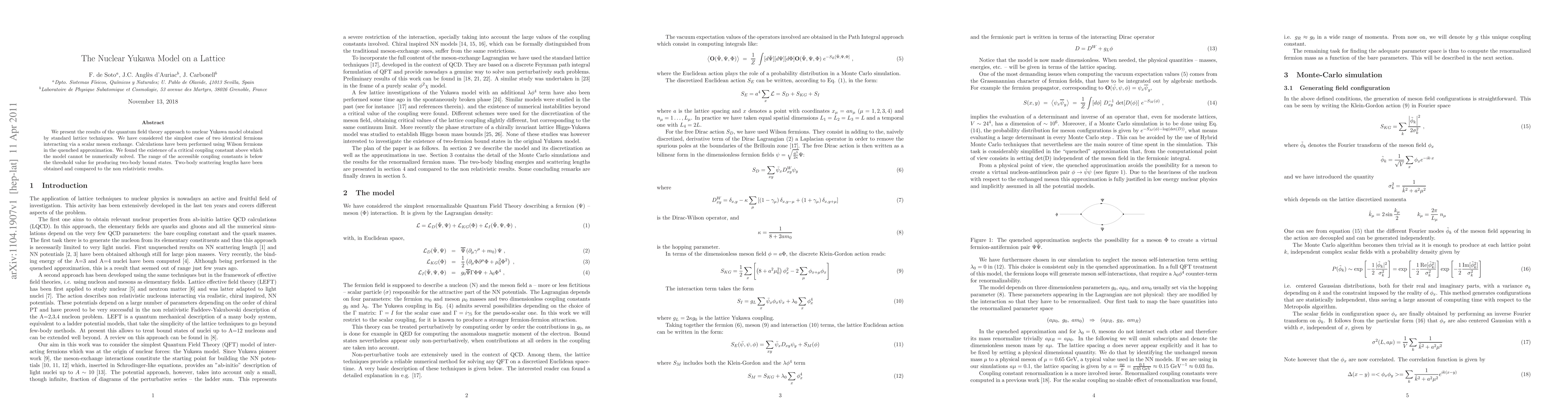 We present the results of the quantum field theory approach to nuclear Yukawa model obtained by standard lattice techniques. We have considered the simplest case of two identical fermions interacting via a scalar meson exchange. Calculations have been performed using Wilson fermions in the quenched approximation. We found the existence of a critical coupling constant above which the model cannot be numerically solved. The range of the accessible coupling constants is below the threshold value for producing two-body bound states. Two-body scattering lengths have been obtained and compared to the non relativistic results.