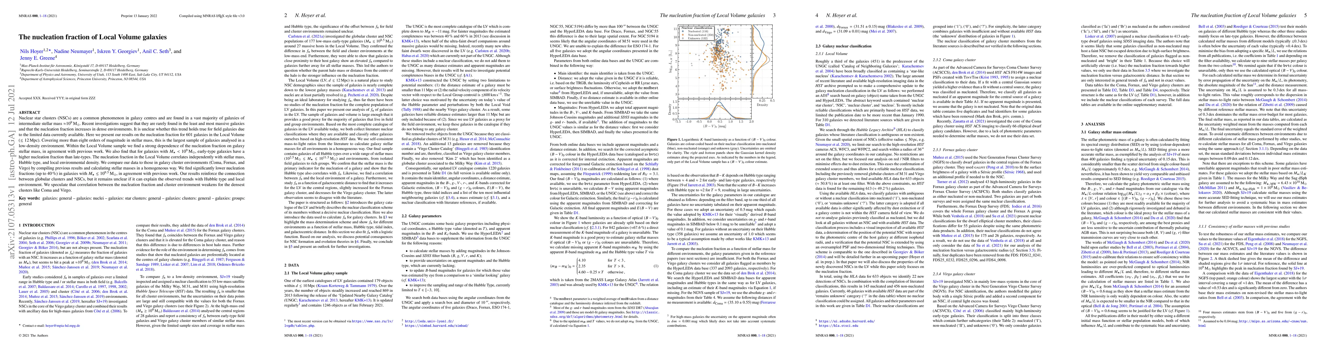Nuclear star clusters (NSCs) are a common phenomenon in galaxy centres and are found in a vast majority of galaxies of intermediate stellar mass $10^{9}$ M$_{\odot}$. Recent investigations suggest that they are rarely found in the least and most massive galaxies and that the nucleation fraction increases in dense environments. It is unclear whether this trend holds true for field galaxies due to the limited data currently available. Here we present our results on the nucleation fraction for 601 galaxies in the Local Volume ($\lesssim 12$ Mpc). Covering more than eight orders of magnitude in stellar mass, this is the largest sample of galaxies analysed in a low-density environment. Within the Local Volume sample we find a strong dependence of the nucleation fraction on galaxy stellar mass, in agreement with previous work. We also find that for galaxies with $M_{\star} < 10^{9}$ M$_{\odot}$, early-type galaxies have a higher nucleation fraction than late-types. The nucleation fraction in the Local Volume correlates independently with stellar mass, Hubble type, and local environmental density. We compare our data to those in galaxy cluster environments (Coma, Fornax, and Virgo) by compiling previous results and calculating stellar masses in a homogeneous way. We find significantly lower nucleation fractions (up to 40$\%$) in galaxies with $M_{\star} \lesssim 10^{9.5}$ M$_{\odot}$, in agreement with previous work. Our results reinforce the connection between globular clusters and NSCs, but it remains unclear if it can explain the observed trends with Hubble type and local environment. We speculate that correlation between the nucleation fraction and cluster environment weakens for the densest clusters like Coma and Virgo.