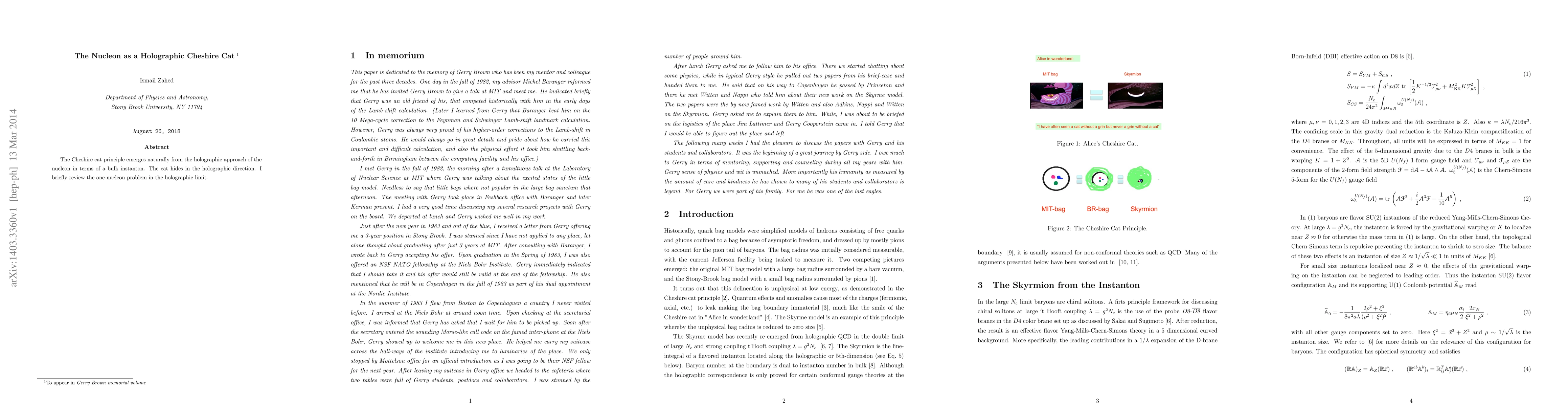 Summary: This paper explores the nucleon through a holographic framework, demonstrating that the "Cheshire cat principle" arises naturally, where the nucleon's properties emerge from the bulk instanton and hide in the holographic direction. The study briefly reviews the one-nucleon problem in the holographic limit.
