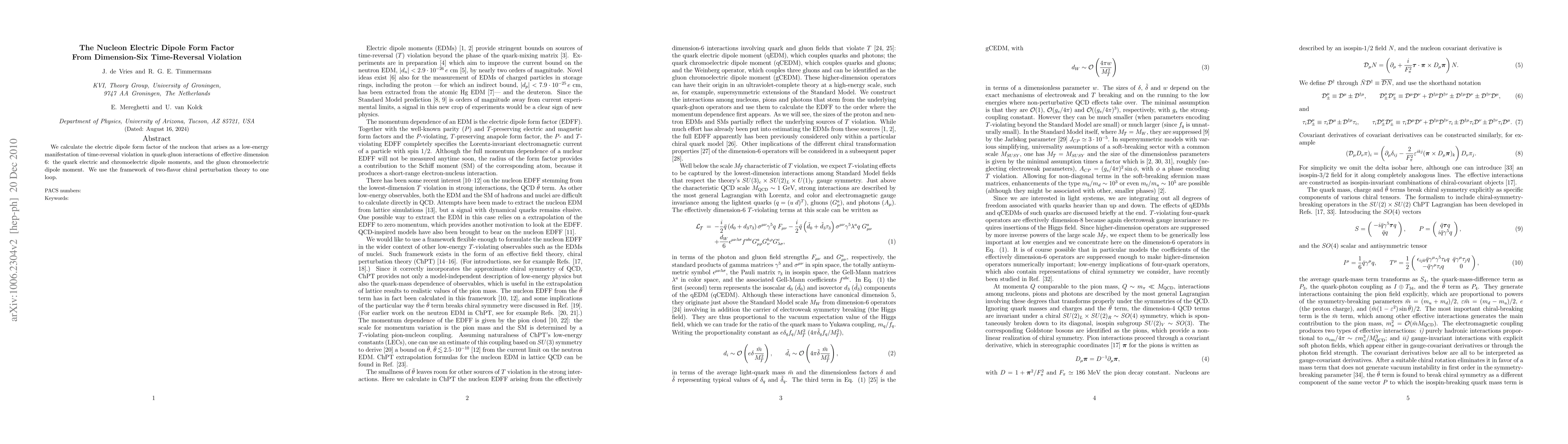 This paper calculates the nucleon electric dipole form factor stemming from time-reversal violation in quark-gluon interactions, focusing on dimension-six operators like quark and gluon dipole moments, using two-flavor chiral perturbation theory to one loop.