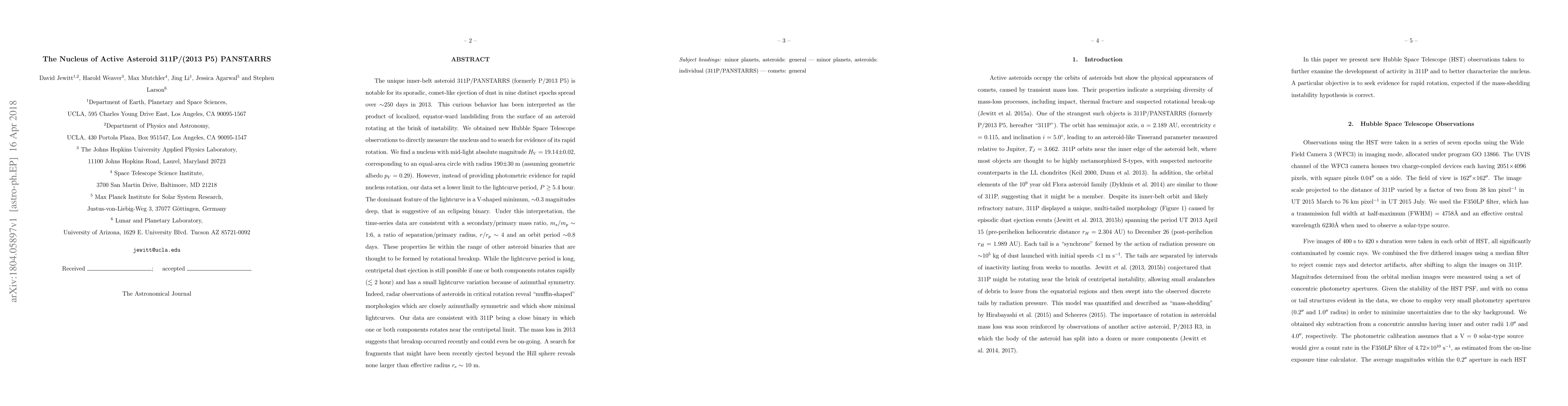 The research investigates the active asteroid 311P/PANSTARRS, noting its sporadic dust ejections and suggesting landsliding as the cause. New Hubble observations reveal a long lightcurve period of at least 5.4 hours, indicating a possible close binary system with one or both components rotating rapidly near the centripetal limit, consistent with recent or ongoing breakup.
