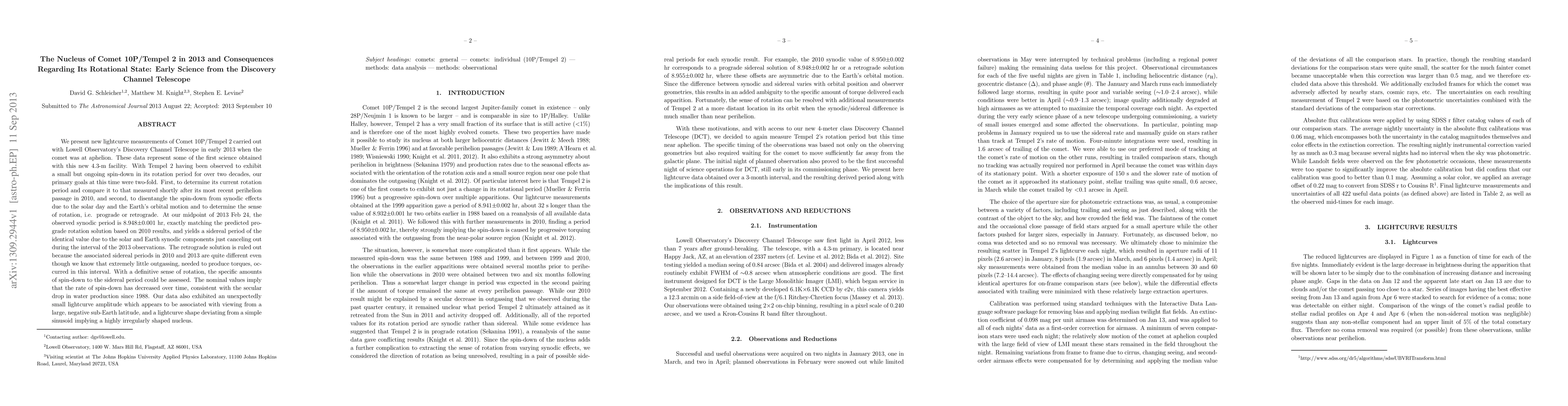 The study used Lowell Observatory's Discovery Channel Telescope to measure Comet 10P/Tempel 2's lightcurve in 2013, confirming its prograde rotation and a decreasing spin-down rate. The comet's nucleus was found to have a small lightcurve amplitude and an irregular shape due to viewing from a large negative sub-Earth latitude.