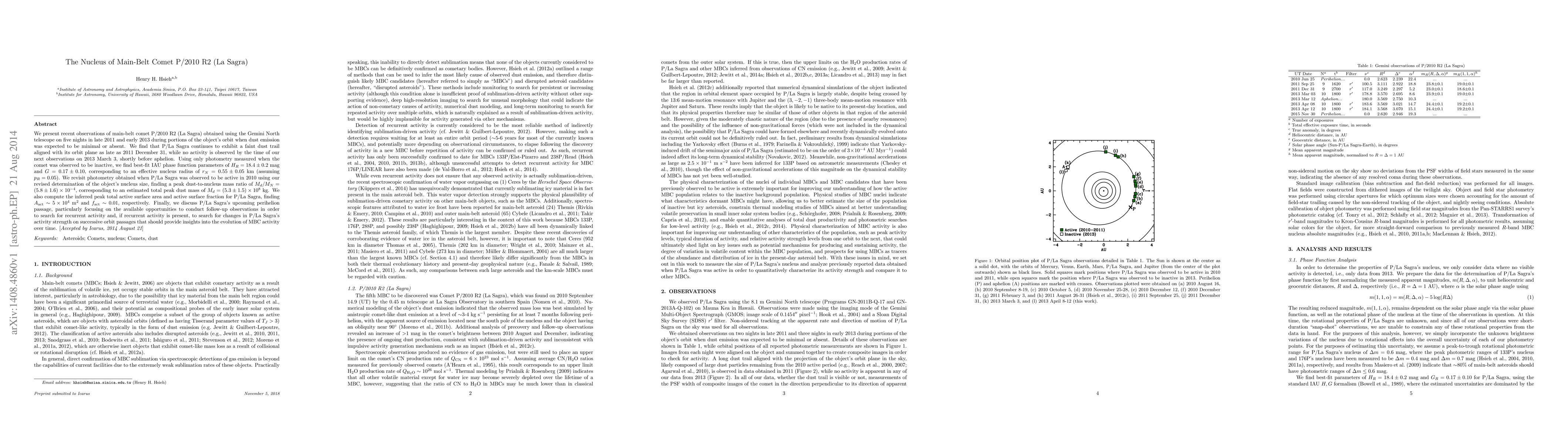 This study uses Gemini North telescope observations to analyze the main-belt comet P/2010 R2 (La Sagra), finding a faint dust trail in 2011 but no activity in 2013. The nucleus radius is estimated at 0.55 km, with a peak dust-to-nucleus mass ratio of 5.8x10^(-4) kg. Future perihelion offers potential for observing recurrent activity and tracking changes over time.