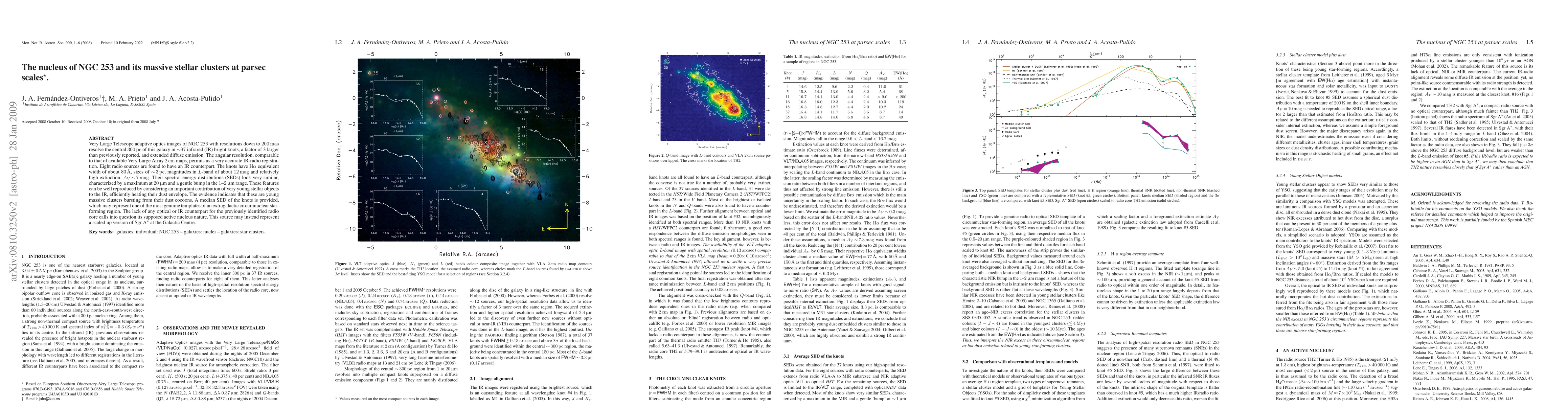 Very Large Telescope adaptive optics images of NGC 253 with resolutions down to 200 mas resolve the central 300 pc of this galaxy in ~ 37 infrared (IR) bright knots, a factor of 3 larger than previously reported, and extended diffuse emission. The angular resolution, comparable to that of available Very Large Array 2 cm maps, permits us a very accurate IR-radio registration. Eight radio sources are found to have an IR counterpart. The knots have H\alpha equivalent width of about 80 angstroms, sizes of ~ 3 pc, magnitudes in L-band of about 12 mag and relatively high extinction, Av ~ 7 mag. Their spectral energy distributions (SEDs) look very similar, characterized by a maximum at 20 micron and a gentle bump in the 1 - 2 micron range. These features can be well reproduced by considering an important contribution of very young stellar objects to the IR, efficiently heating their dust envelope. The evidence indicates that these are young massive clusters bursting from their dust cocoons. A median SED of the knots is provided, which may represent one of the most genuine templates of an extragalactic circumnuclear star-forming region. The lack of any optical or IR counterpart for the previously identified radio core calls into question its supposed active nucleus nature. This source may instead represent a scaled up version of Sgr A* at the Galactic Centre.