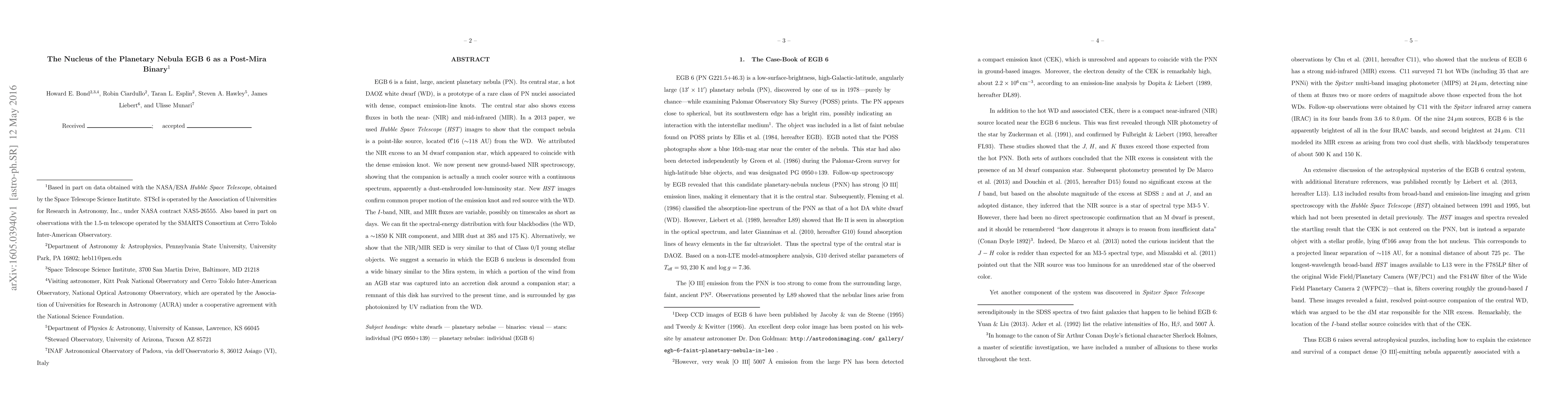 The central star of the planetary nebula EGB 6 is a DAOZ white dwarf with a cooler, dust-enshrouded companion star, suggesting a post-Mira binary system. The nebula's emission features and variable fluxes indicate a complex interaction between the white dwarf and its companion.