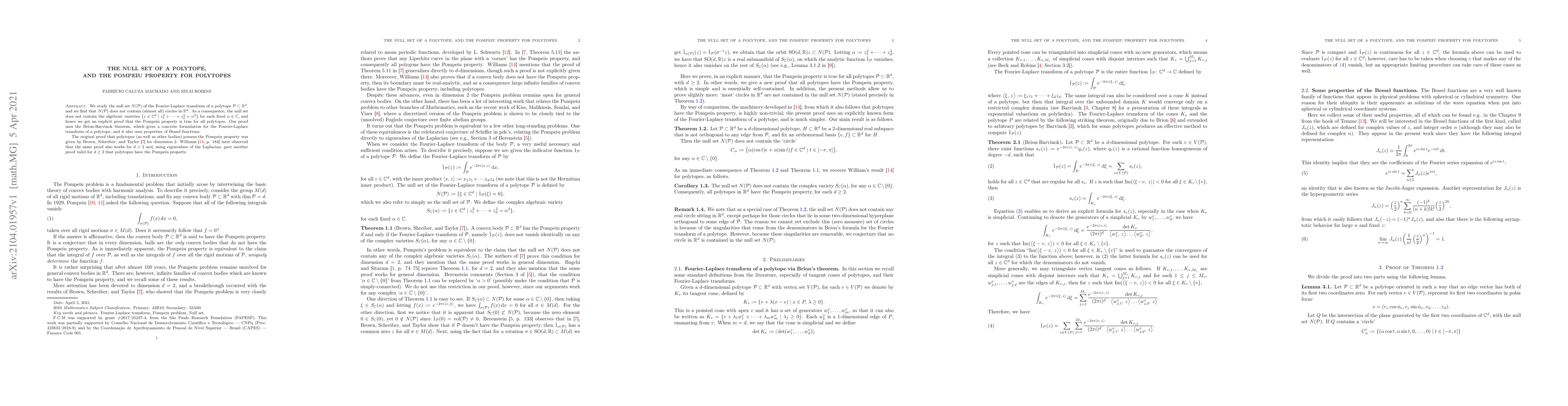 We study the null set $N(\mathcal{P})$ of the Fourier-Laplace transform of a polytope $\mathcal{P} \subset \mathbb{R}^d$, and we find that $N(\mathcal{P})$ does not contain (almost all) circles in $\mathbb{R}^d$. As a consequence, the null set does not contain the algebraic varieties $\{z \in \mathbb{C}^d \mid z_1^2 + \dots + z_d^2 = \alpha^2\}$ for each fixed $\alpha \in \mathbb{C}$, and hence we get an explicit proof that the Pompeiu property is true for all polytopes. Our proof uses the Brion-Barvinok theorem, which gives a concrete formulation for the Fourier-Laplace transform of a polytope, and it also uses properties of Bessel functions. The original proof that polytopes (as well as other bodies) possess the Pompeiu property was given by Brown, Schreiber, and Taylor (1973) for dimension 2. Williams (1976) later observed that the same proof also works for $d>2$ and, using eigenvalues of the Laplacian, gave another proof valid for $d \geq 2$ that polytopes have the Pompeiu property.