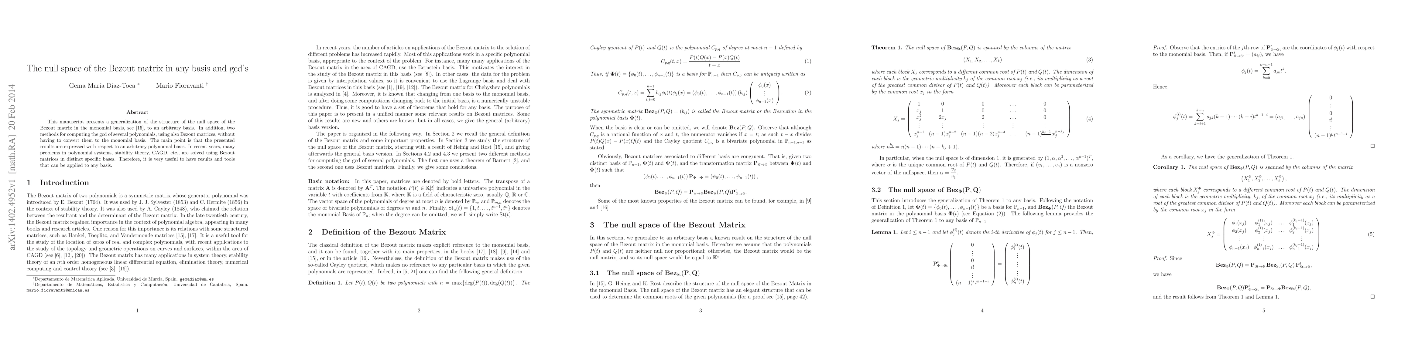 This manuscript presents a generalization of the structure of the null space of the Bezout matrix in the monomial basis, see [G. Heinig and K. Rost, Algebraic methods for toeplitz-like matrices and operators, 1984], to an arbitrary basis. In addition, two methods for computing the gcd of several polynomials, using also Bezout matrices, without having to convert them to the monomial basis. The main point is that the presented results are expressed with respect to an arbitrary polynomial basis. In recent years, many problems in polynomial systems, stability theory, CAGD, etc., are solved using Bezout matrices in distinct specific bases. Therefore, it is very useful to have results and tools that can be applied to any basis.