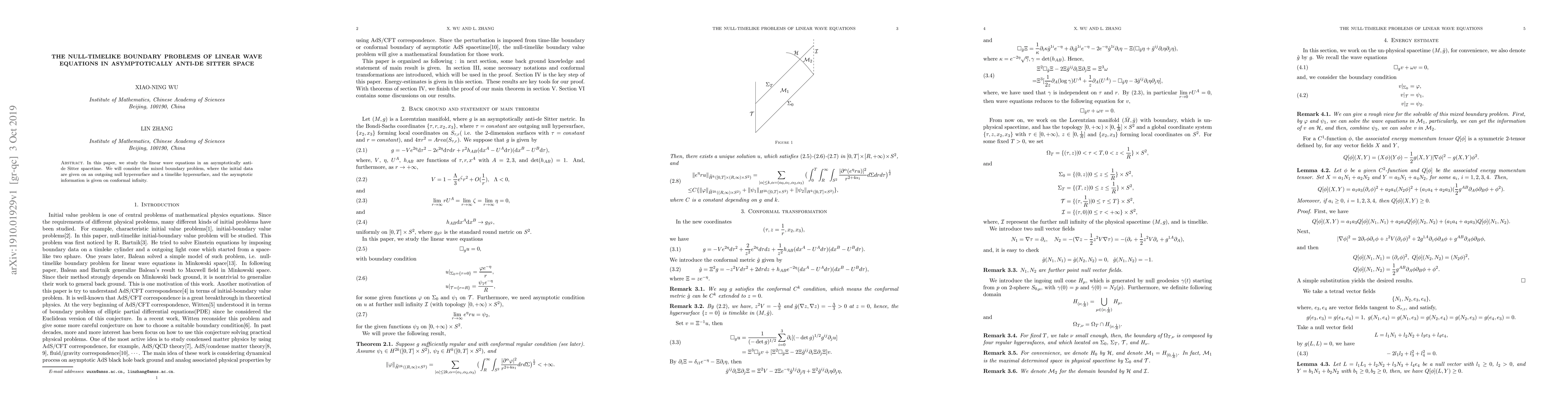 In this paper, we study the linear wave equations in an asymptotically anti-de Sitter spacetime. We will consider the mixed boundary problem, where the initial data are given on an outgoing null hypersurface and a timelike hypersurface, and the asymptotic information is given on conformal infinity.