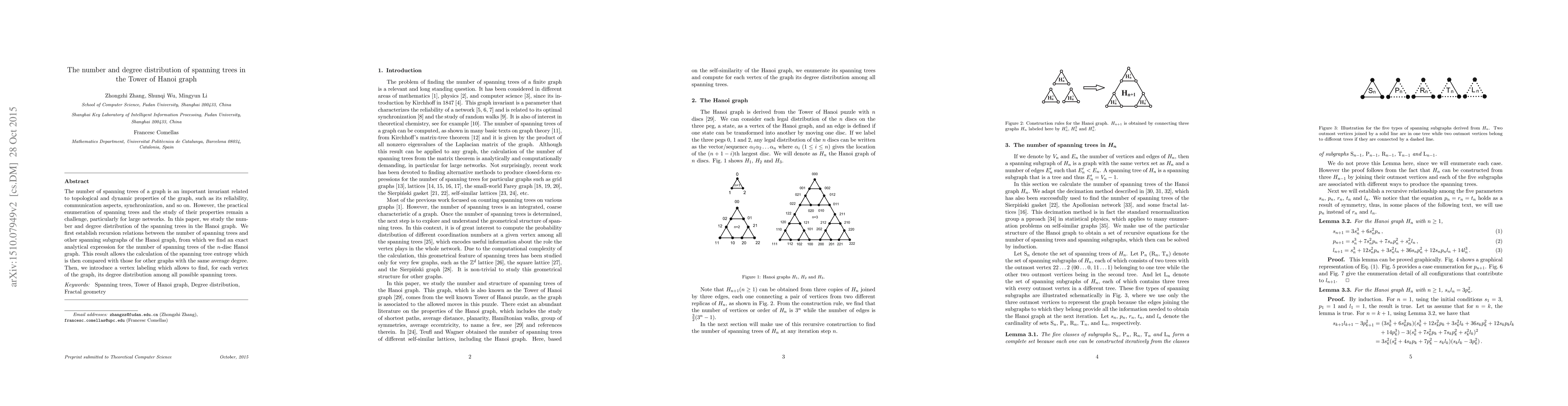 The paper presents a recursive relation approach to find the number of spanning trees and subgraphs in the Hanoi graph, leading to an exact analytical expression for any number of discs.
