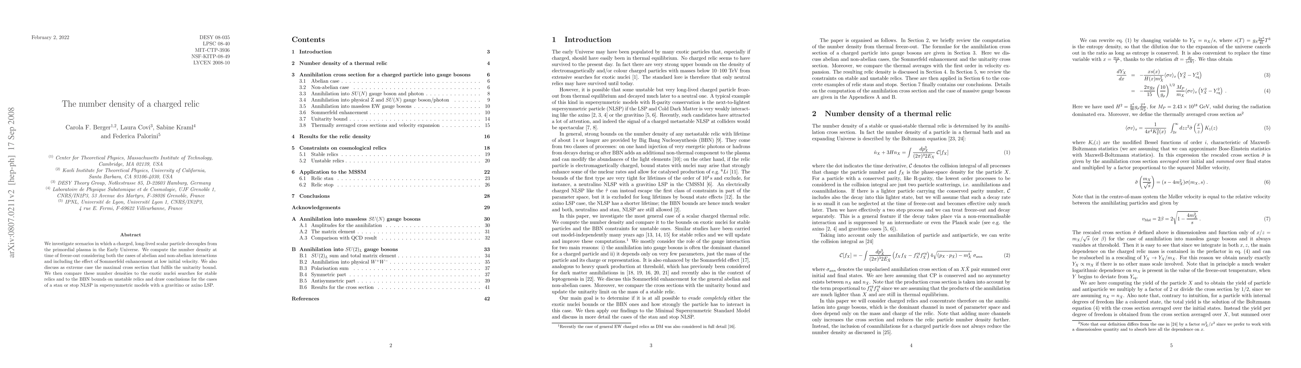 We investigate scenarios in which a charged, long-lived scalar particle decouples from the primordial plasma in the Early Universe. We compute the number density at time of freeze-out considering both the cases of abelian and non-abelian interactions and including the effect of Sommerfeld enhancement at low initial velocity. We also discuss as extreme case the maximal cross section that fulfils the unitarity bound. We then compare these number densities to the exotic nuclei searches for stable relics and to the BBN bounds on unstable relics and draw conclusions for the cases of a stau or stop NLSP in supersymmetric models with a gravitino or axino LSP.